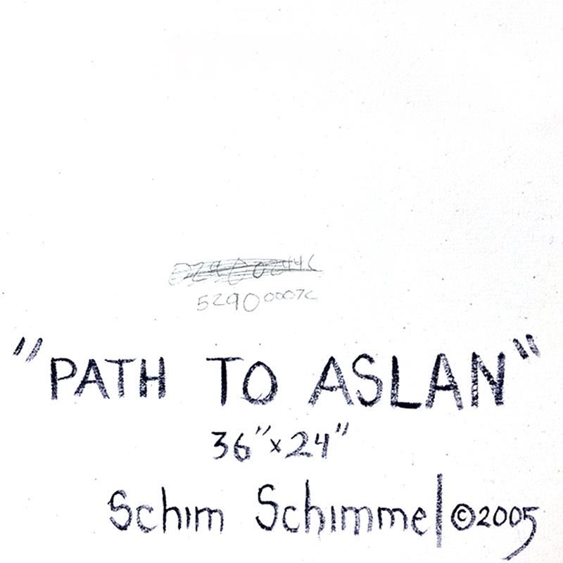 Path to Aslan by Schimmel Original. Please see photos and description for all available information. "Path to Aslan" is an original acrylic painting on stretched canvas by William Schimmel, hand signed by the artist. This piece is titled and dated 2005 inverso. Includes Letter of Authenticity. Measures approx. 48" x 24" (image).