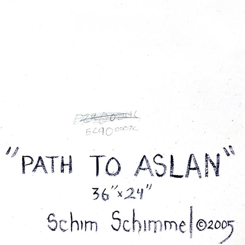 "Path to Aslan" is a hand signed original painting, acrylic on canvas by William Schimmel featuring the famed character from C.S. Lewis' classic, The Chronicles of Narnia. This piece is titled and dated 2005 in verso. Includes Letter of Authenticity. Meas