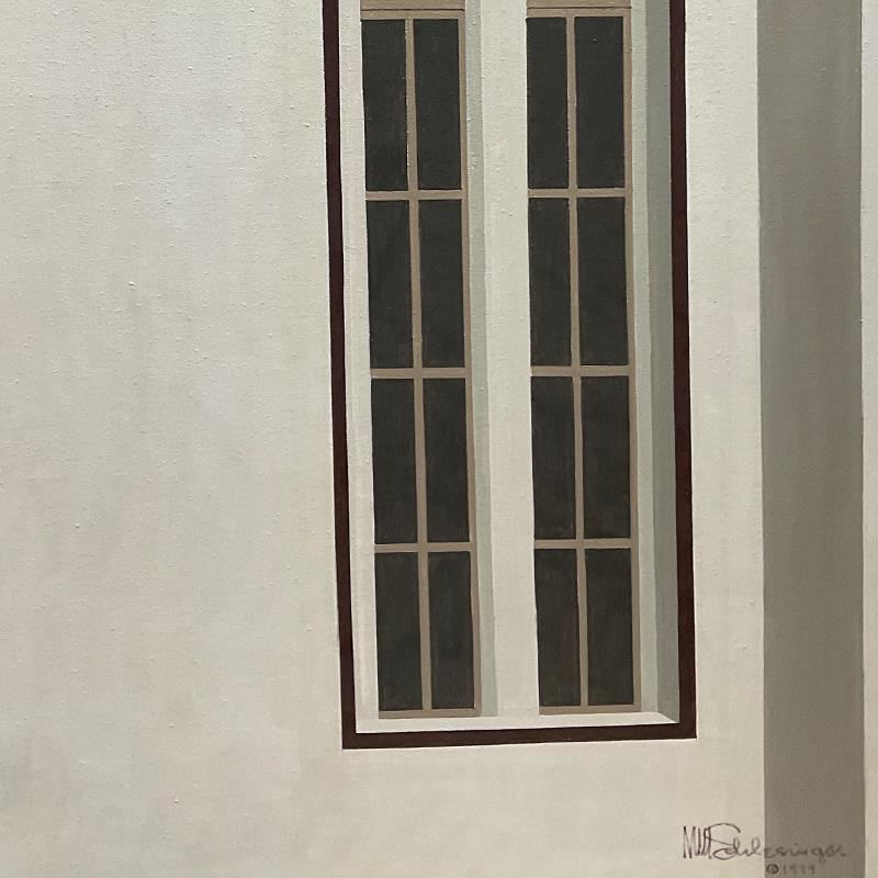 "Pathway To" is an original oil painting on canvas by William Schlesinger (1915-2011), dated 1979 and hand signed by the artist. This piece comes framed in a box frame; due to the age of the piece there is minor wear on the corners and edges of the frame. Includes Letter of Authenticity. Measures approx. 48.5" x 60.5" (frame), 48" x 60" (image). There is a faint scratch on the bottom-left part of the canvas that is only visible upon close inspection.