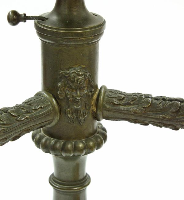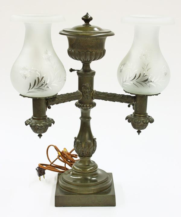 Argand style lamp, executed in patinated metal and having cut bulbous shades having a floral motif, the standard having applied acanthus detail at the waist and rising on a square plinth (electrified) 18.5''h x 13''w