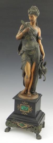Patinated Spelter Figure of Diana, 19th c, on a malachite inlaid gilt decorated black granite base, H.- 19 in., W.- 6 in., D.- 4 1/2 in.