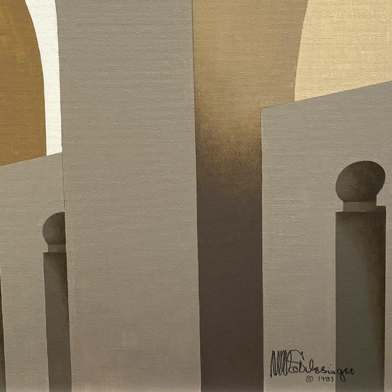 "Patio Del Sol" is an original oil painting on canvas by William Schlesinger (1915-2011), dated 1983 and hand signed by the artist. This piece comes framed in a box frame; due to the age of the piece there is minor wear on the corners and edges of the frame. Includes Letter of Authenticity. Measures approx. 40" x 48.5" (frame), 39.5" x 48" (image). There is minor wear on the frame and some creasing on the canvas.