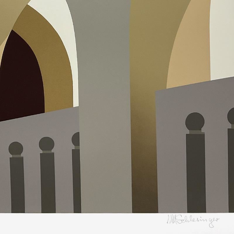 "Patio Del Sol" is a limited edition serigraph from an HC Edition on paper by William Schlesinger (1915-2011), hand signed by the artist. Includes Letter of Authenticity. Measures approx. 30" x 26" (border), 26" x 21.5" (image). ** Please note: There are small faint scratches on the bottom-right part of the image and minor creases on the bottom white border. **