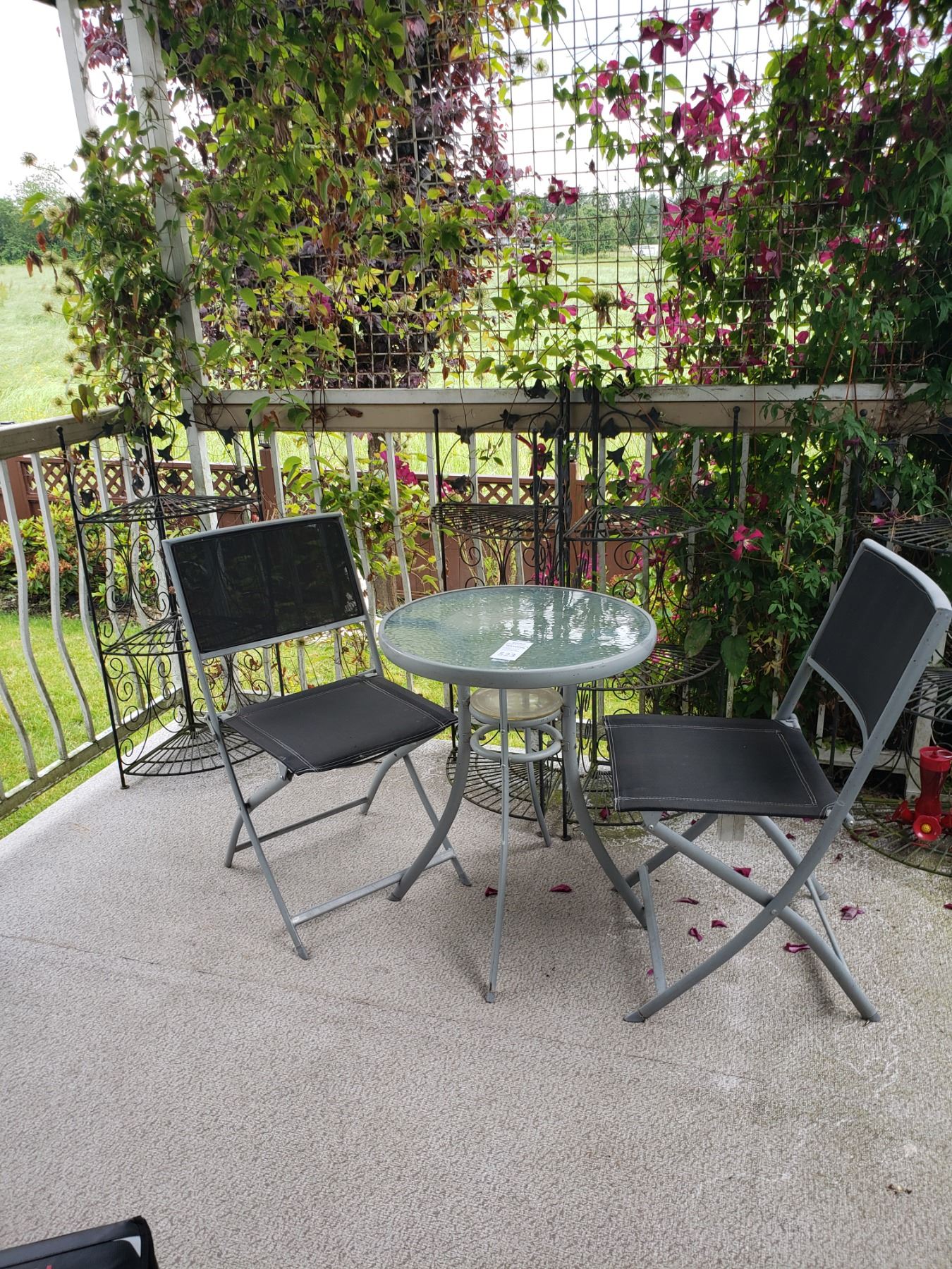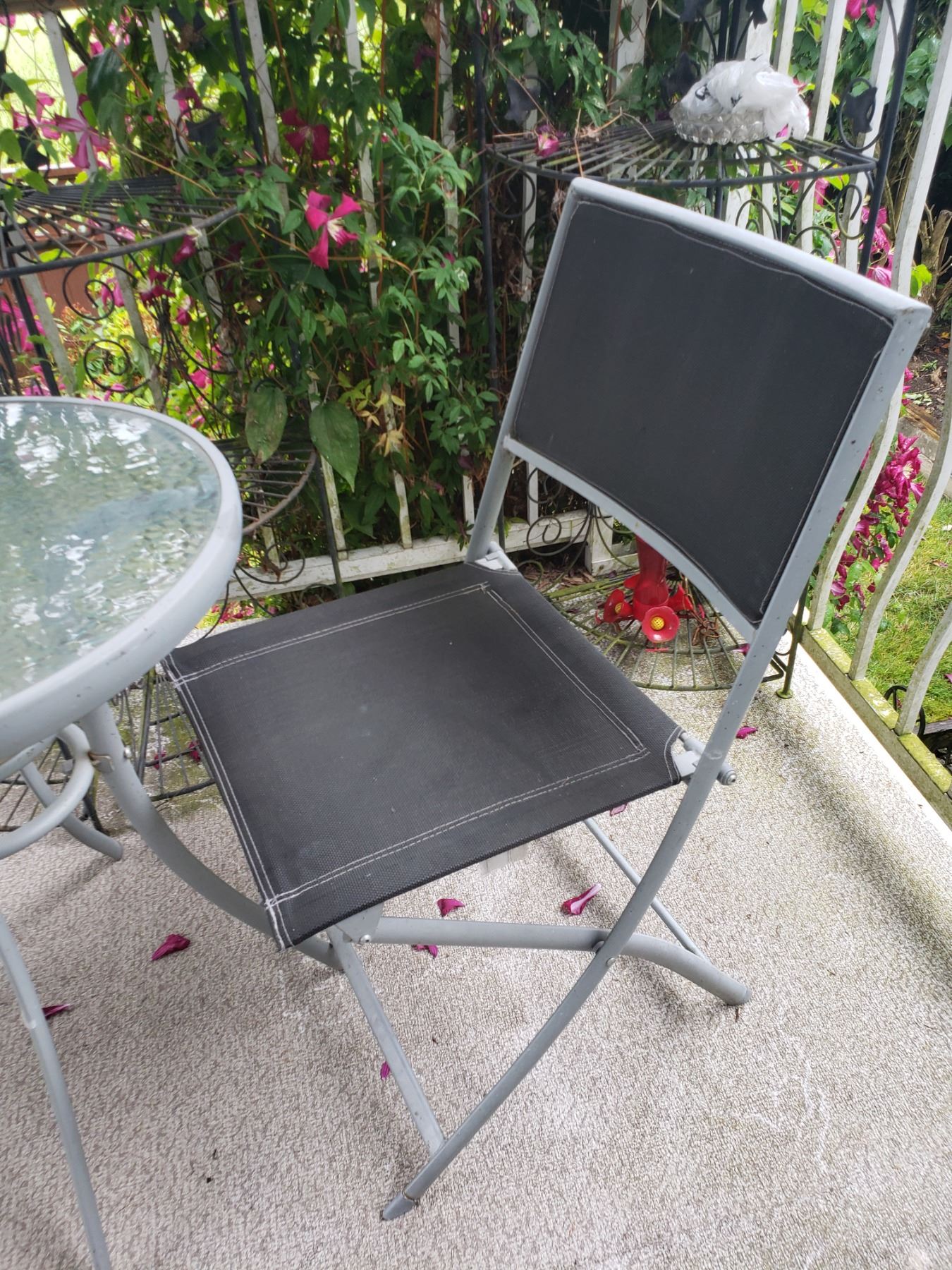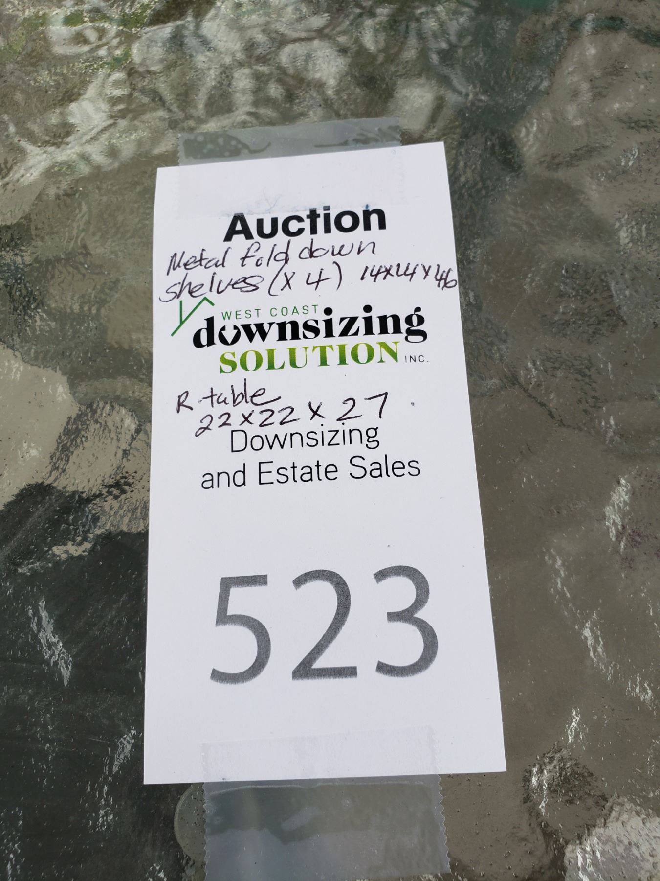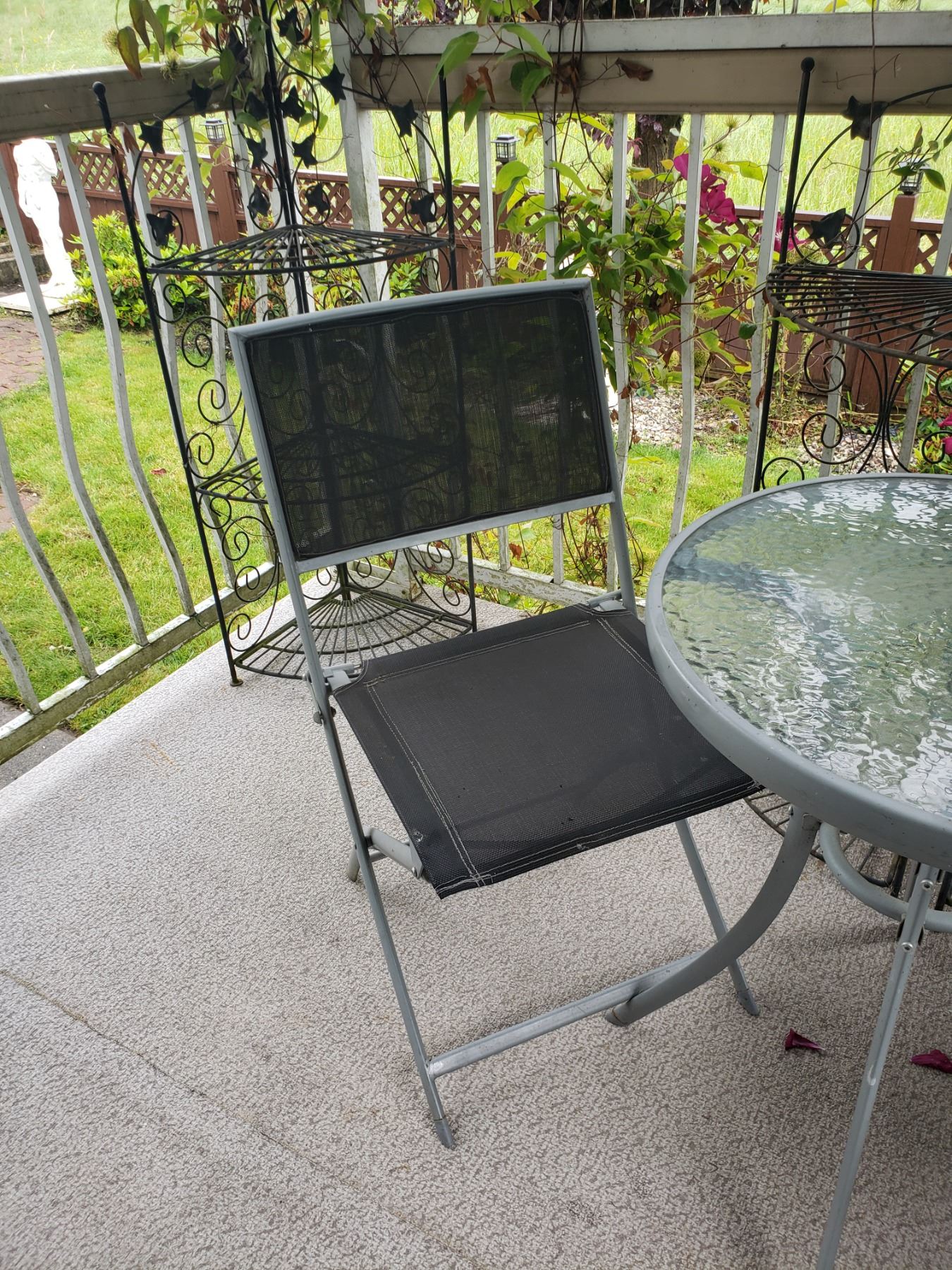 Table(22x22x27”) 2 chairs and 4x foldout metal shelves (46”h) some rust and wear. pickup between 10-11am