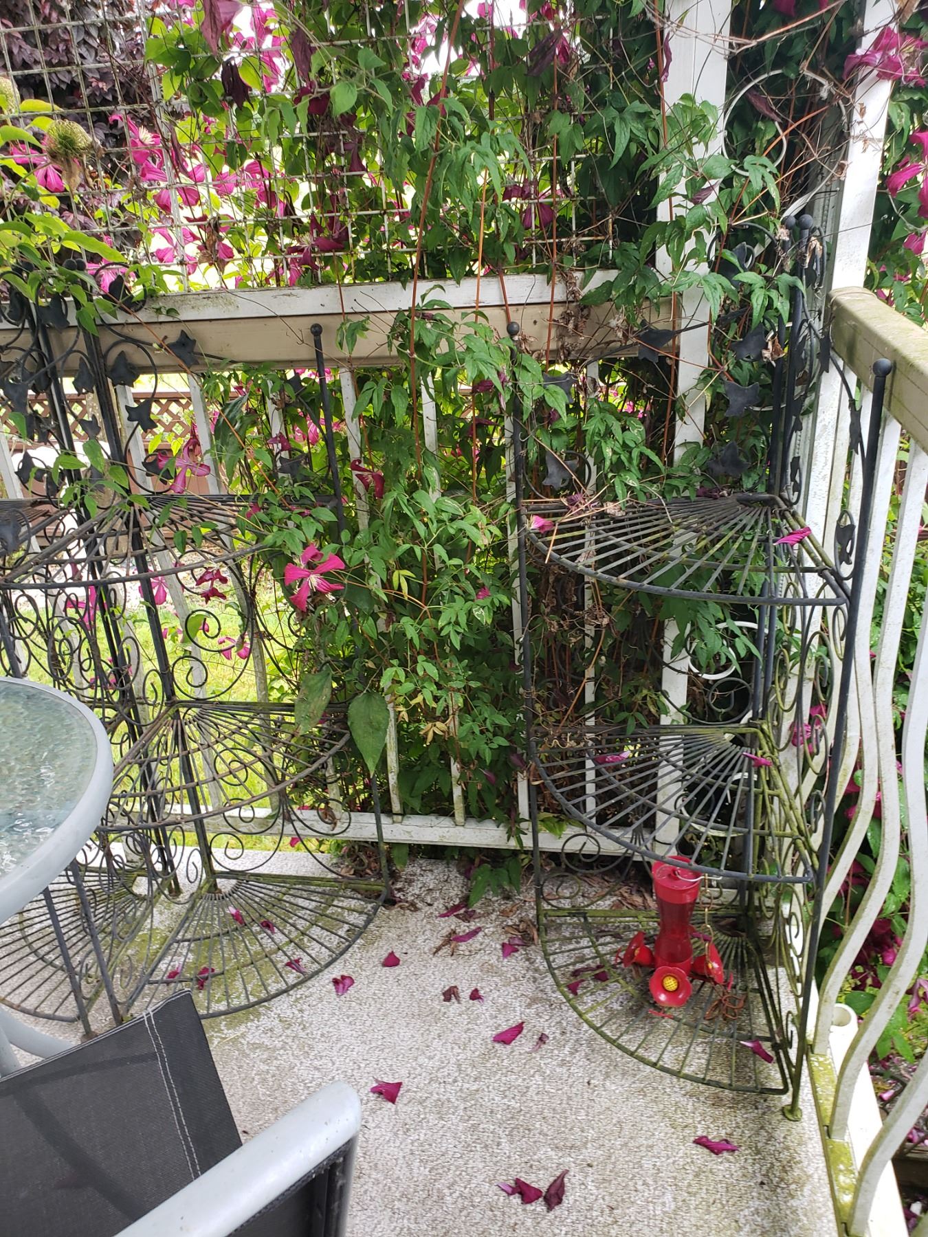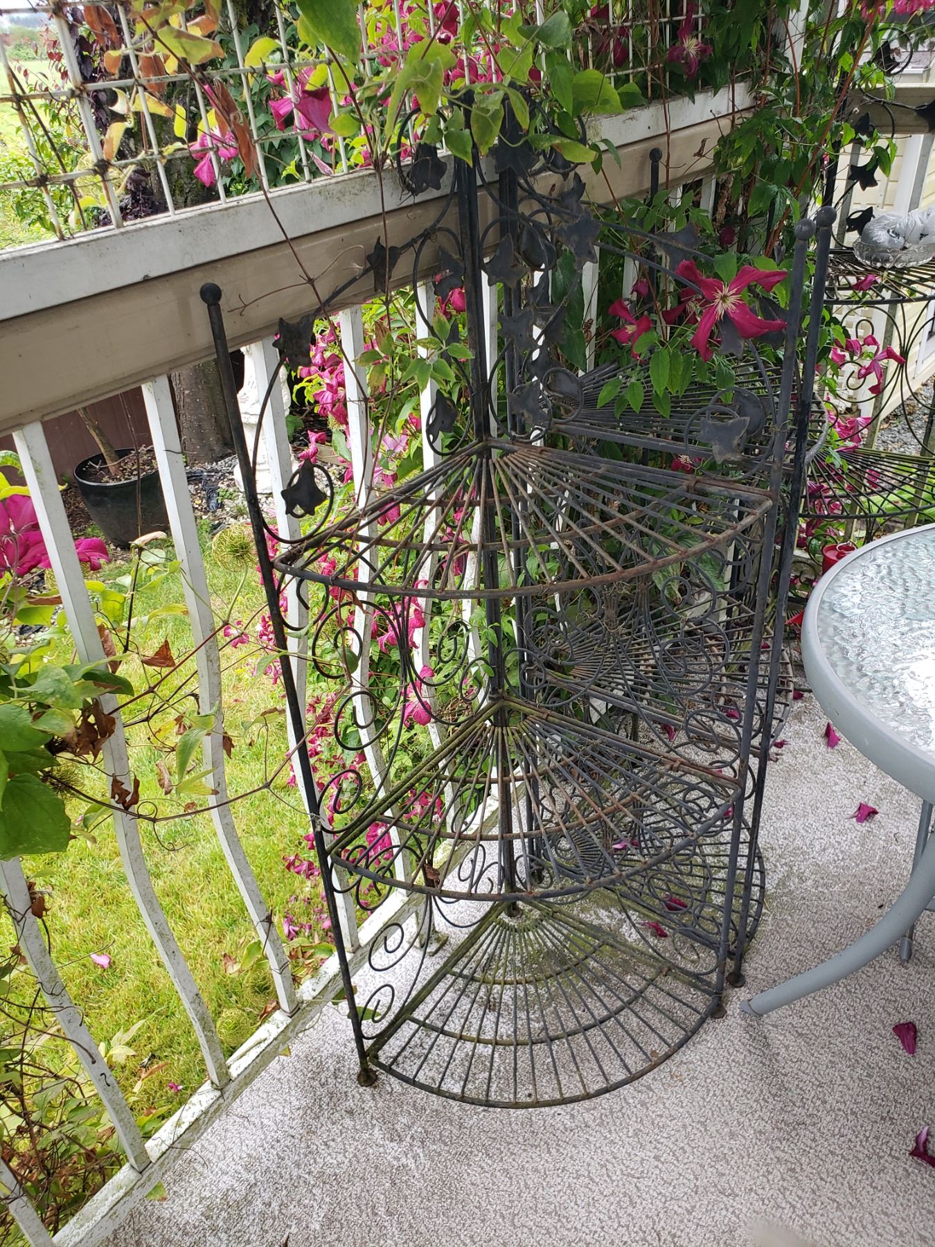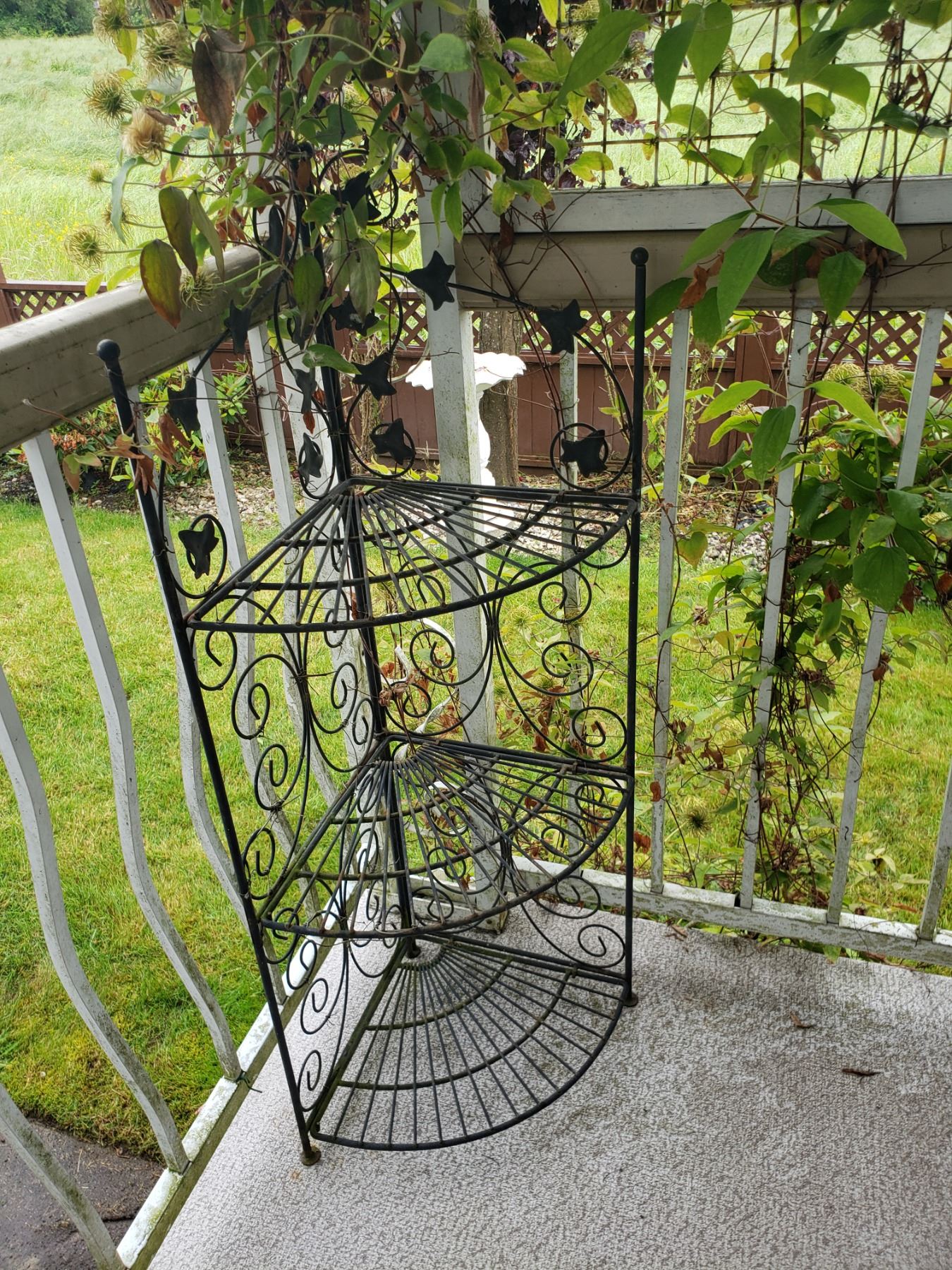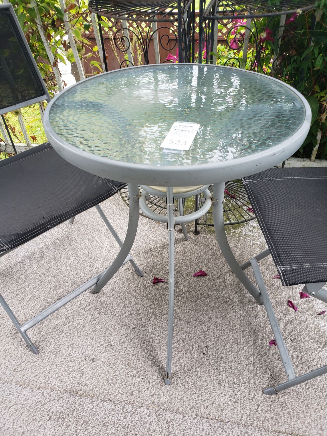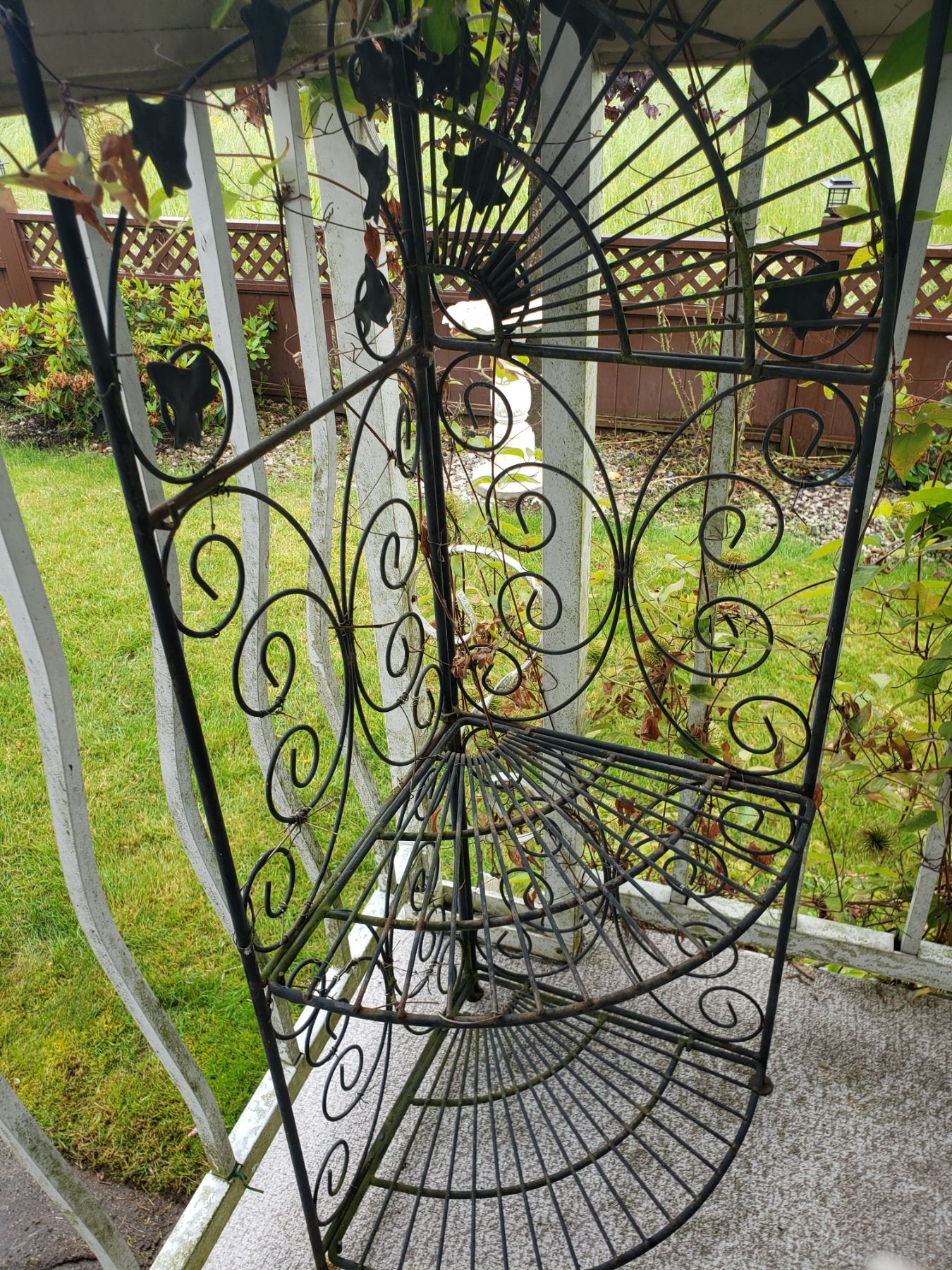 Table(22x22x27”) 2 chairs and 4x foldout metal shelves (46”h) some rust and wear. pickup between 10-11am
