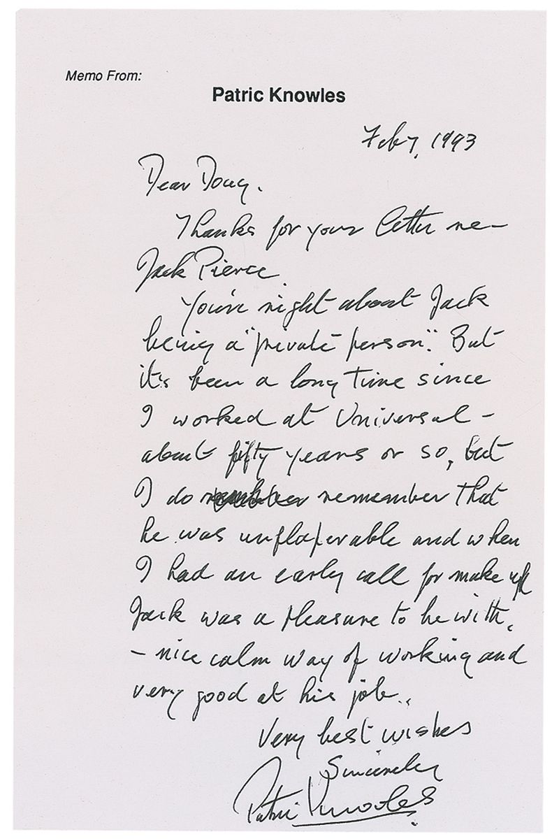 ALS, one page, 5.5 x 8.5, personal letterhead, February 7, 1993. Short letter in response to a fan. In part: “Thanks for your letter re—Jack Pierce…I do remember that he was unflaperable [sic] and when I had an early call for make up Jack was a pleasure to be with—nice calm way of working and very good at his job.” In fine condition, with trivial creasing in the upper right. A great behind-the-scenes look into Hollywood’s horror era.
