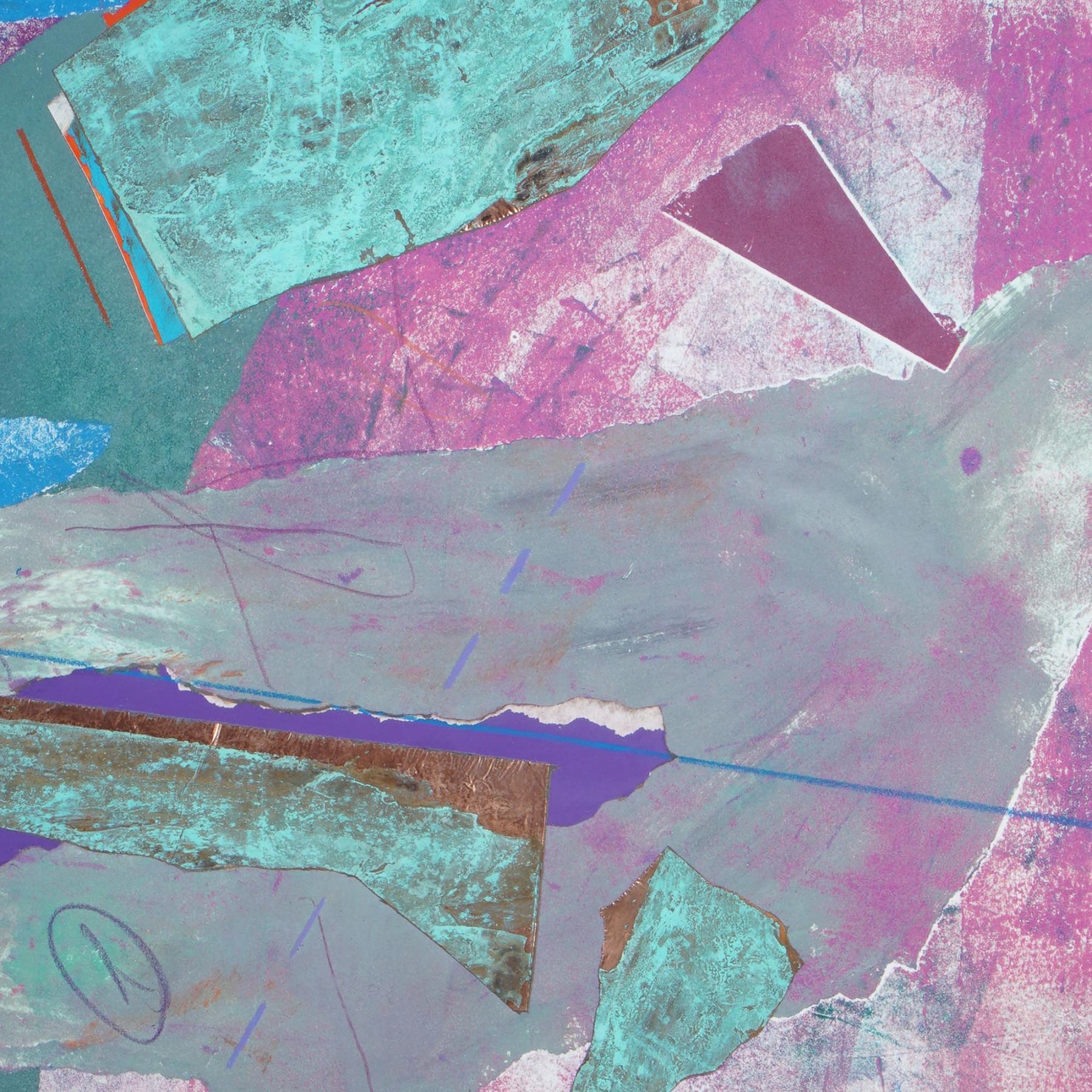 Dynamic abstract screenprint mixed media collage by Patricia A. Beatty, a contemporary American artist known for her layered, textural compositions that merge vivid color, geometric form, gold color leaf, and painterly abstraction. This large-scale work bursts with movement and complexity, showcasing Beatty's signature technique of blending torn paper elements with painted surfaces to create a rich, multi-dimensional visual experience. A dominant field of deep plum and violet tones fills the upper portion, intricately overlaid with gestural markings and translucent scrapes of color, contrasted by energetic shards of teal, turquoise, copper, and magenta across the lower half. Linear accents and sporadic scribble-like etchings lend the work a sense of spontaneity, while carefully balanced compositional weight reveals Beatty's refined eye for spatial harmony. The piece is signed at the lower right in graphite, presented under protective glass in a white contemporary frame. A bold and sophisticated work ideal for collectors of abstract expressionism and modern mixed media art.