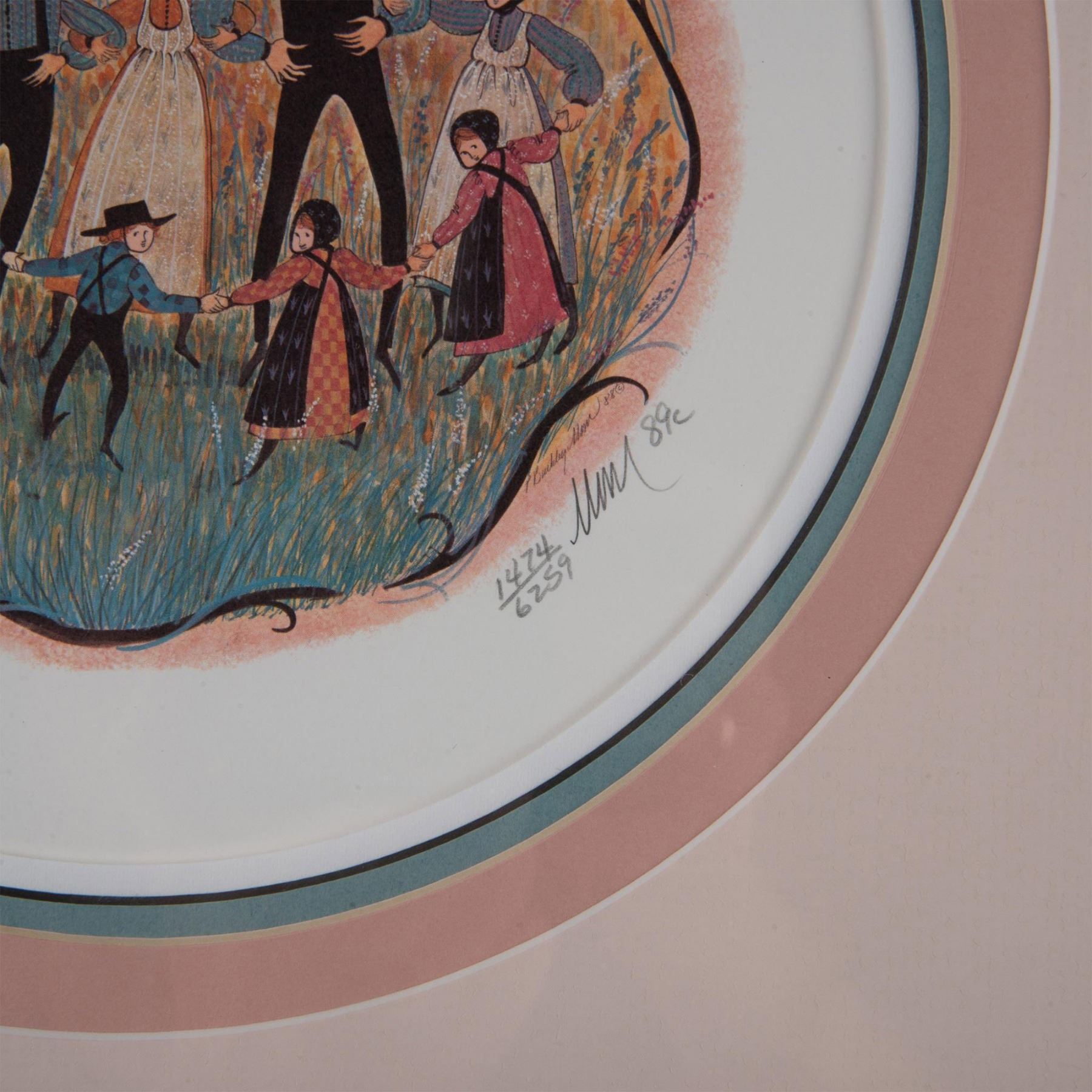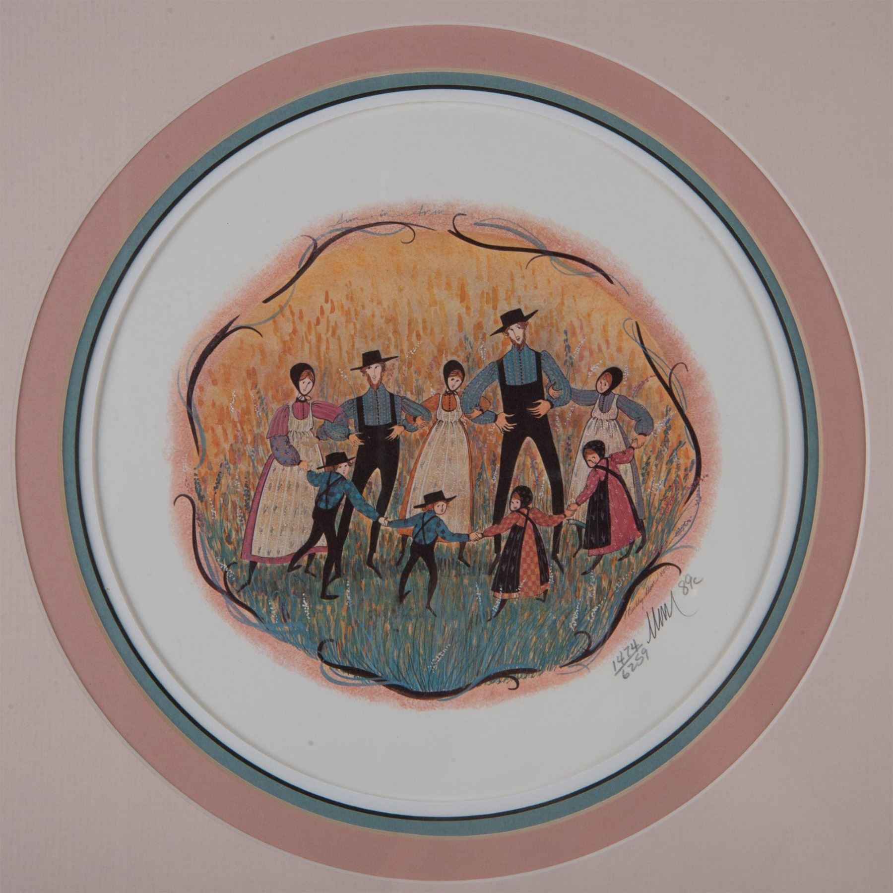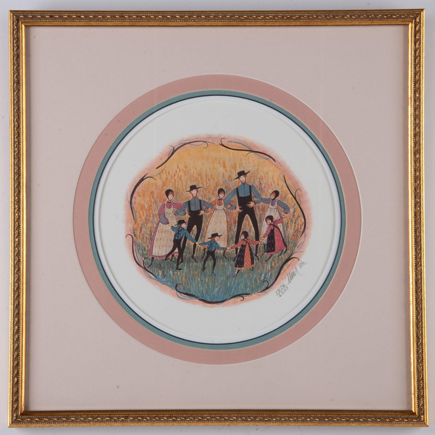 Signed limited edition print on tondo paper by American Artist Patricia Buckley Moss. Amish scene of people linking arms with one another. Titled Arm in Arm. Artist signature, dated and numbered on lower right. Sight dimensions: 6.5"L x 6.5"L. Frame dimensions: 13.8"L x 13.8"H x 1"D. Artwork can be unframed and rolled for shipment.