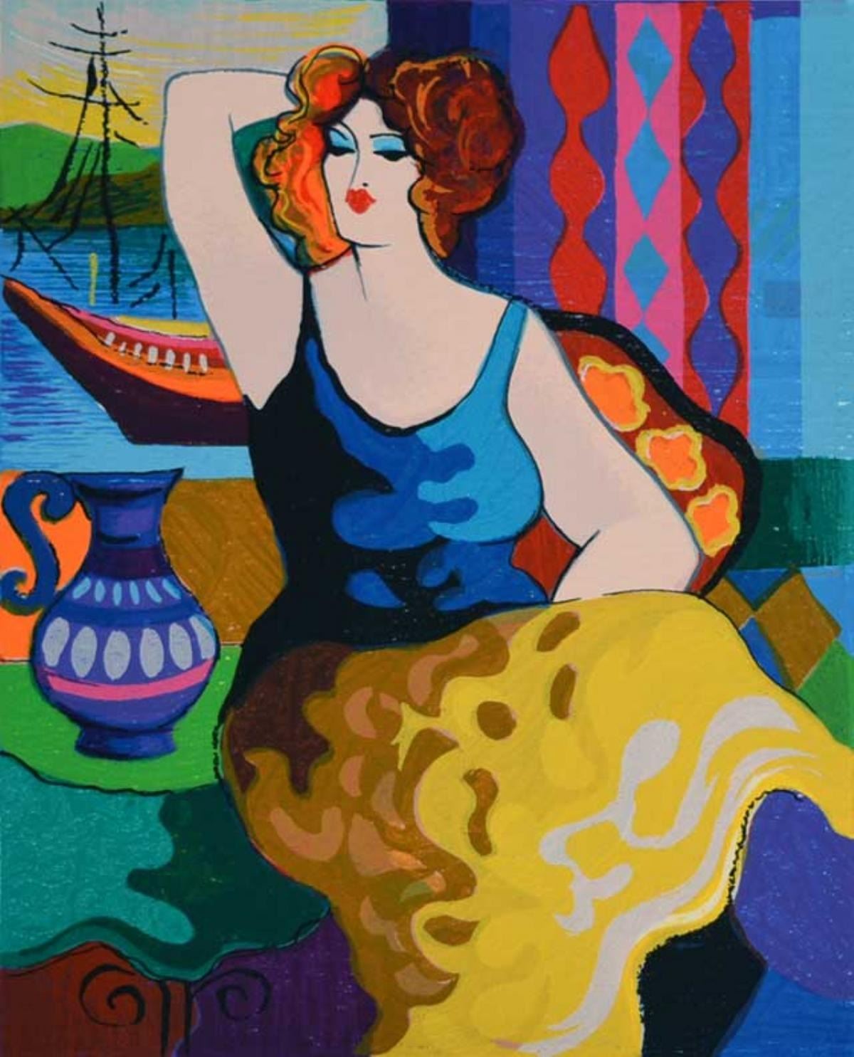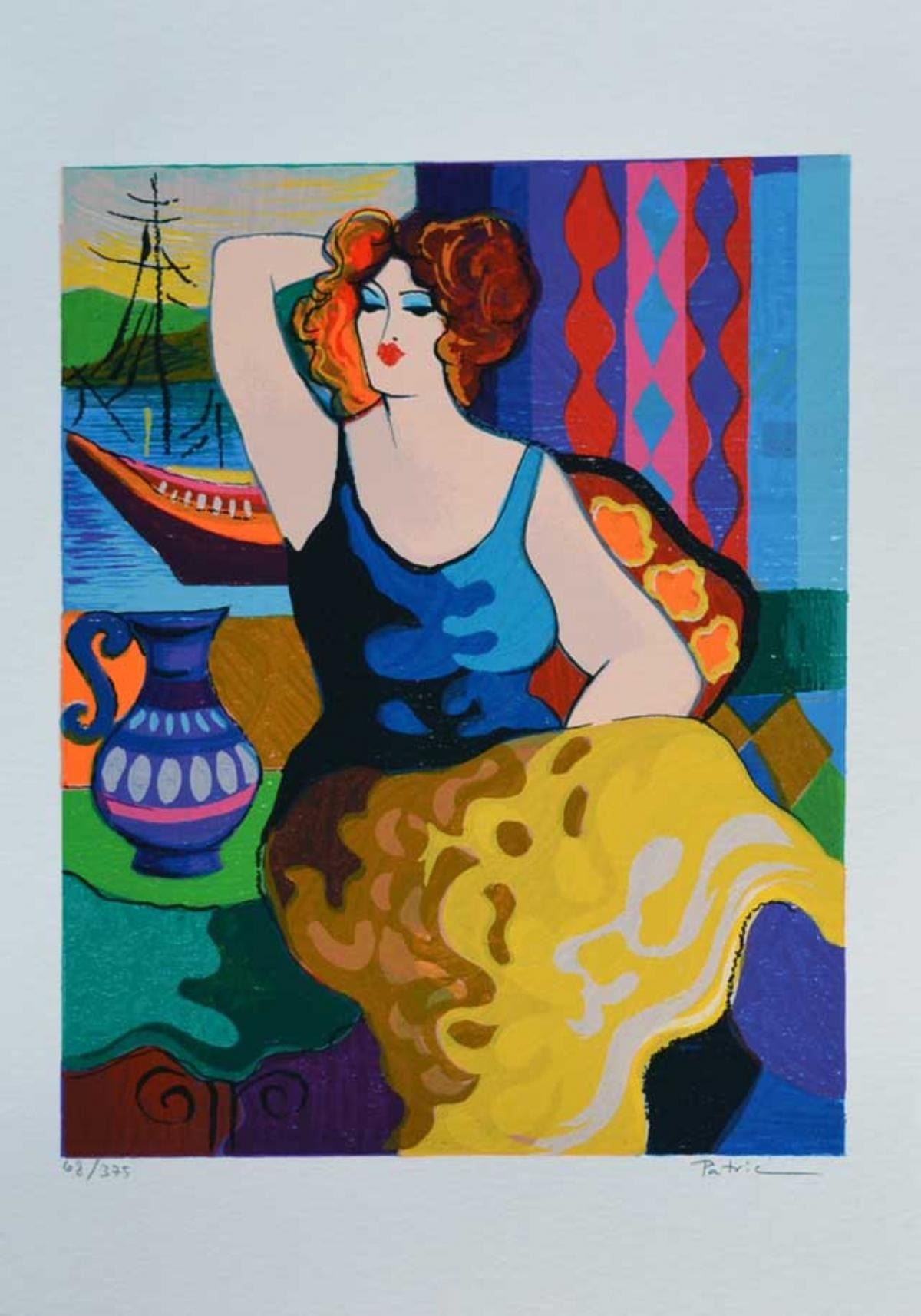 Artist: Patricia Govezensky - Title: Gloria - Medium: Serigraph on Fine Art Paper - Signature: Hand-signed by the Artist - Limited Edition: 375 - Image Size: Approximately 8 Inches x 6.25 inches - Paper Size: Approximately 10.75 inches x 7.75 inches - Unframed - Details: This work comes with a Certificate of Authenticity - Patricia, a sensitive artist, brings to her canvas the immortal effeminate woman, combining her tender touch and simplicity with magic moments of beauty in delicate domain. She invites us to share the public intimacy of an informal French Cafe and the euphoric mystery of a woman?s room.
