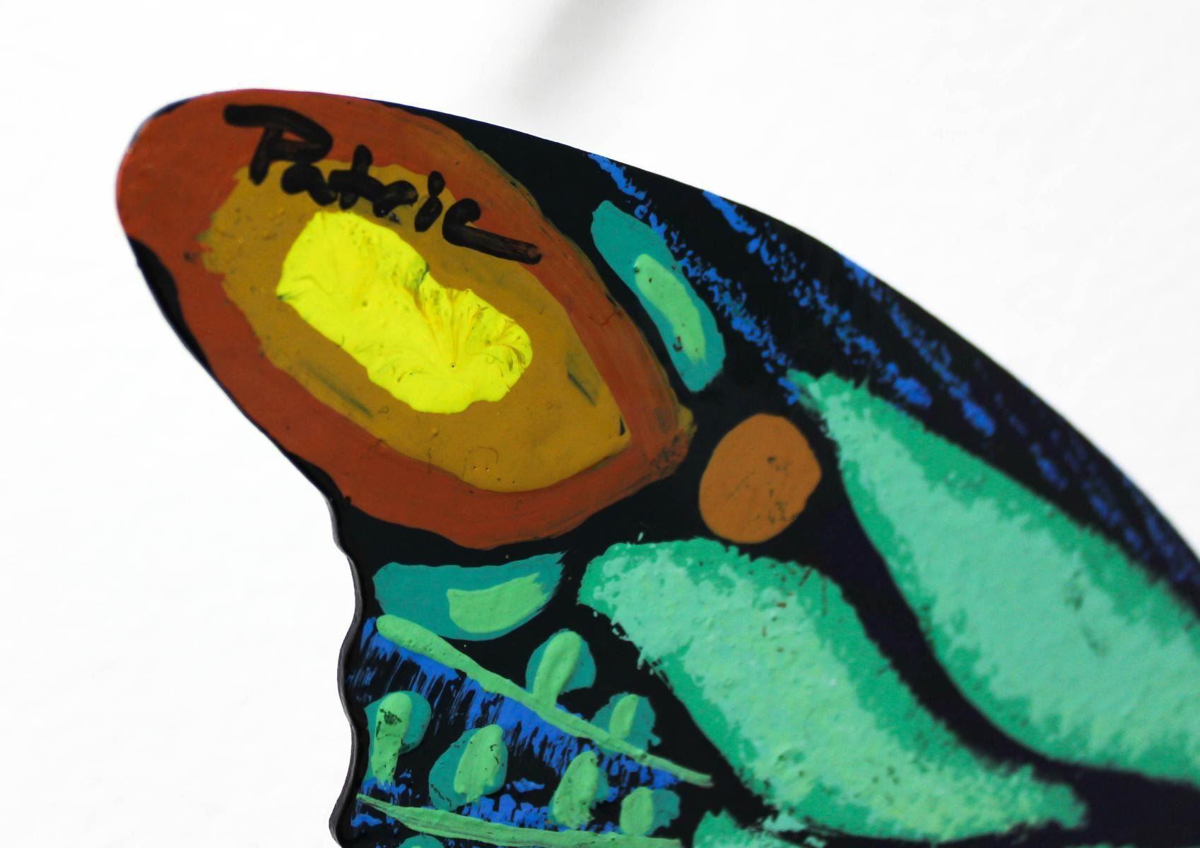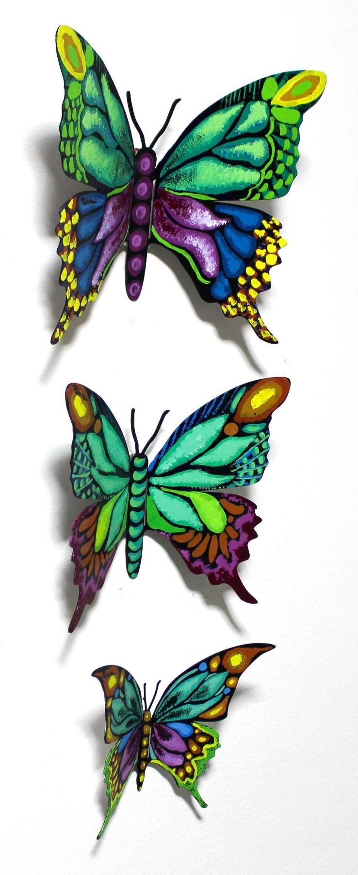 Artist: Patricia Govezensky. Medium: Original Painting on Cutout Steel (Set of 3). Title: Set of 3 Butterflies. Size (Unframed): 7" x 9.5". Certificate of Authenticity: From the publisher. Additional: Size Butterfly 1: 5x8" , Size Butterfly 2: 7x9.5" , Size Butterfly 3: 8.5x11.5". Reference# 11909.