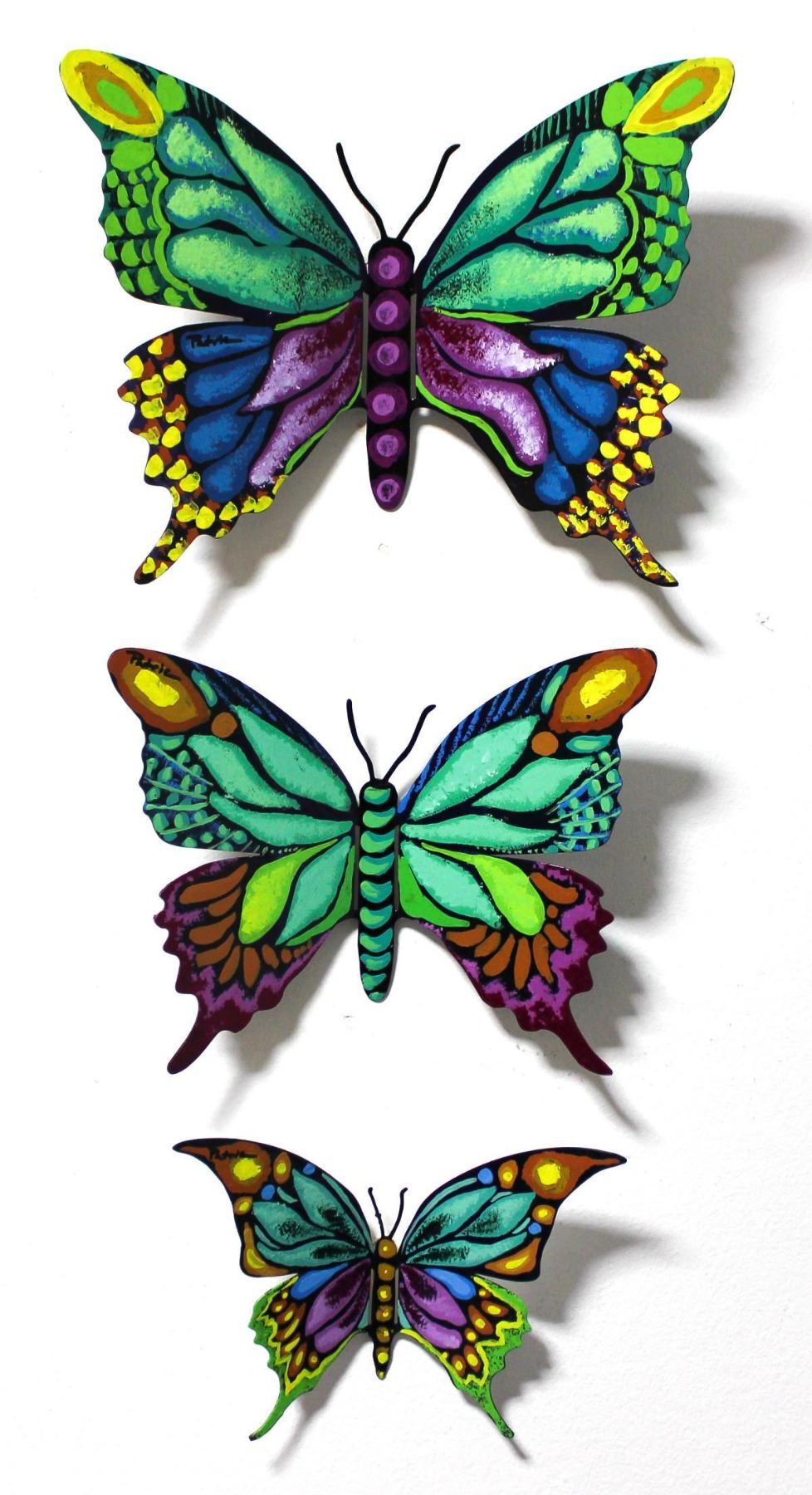 Artist: Patricia Govezensky. Medium: Original Painting on Cutout Steel (Set of 3). Title: Set of 3 Butterflies. Size (Unframed): 7" x 9.5". Certificate of Authenticity: From the publisher. Additional: Size Butterfly 1: 5x8" , Size Butterfly 2: 7x9.5" , Size Butterfly 3: 8.5x11.5". Reference# 11909.