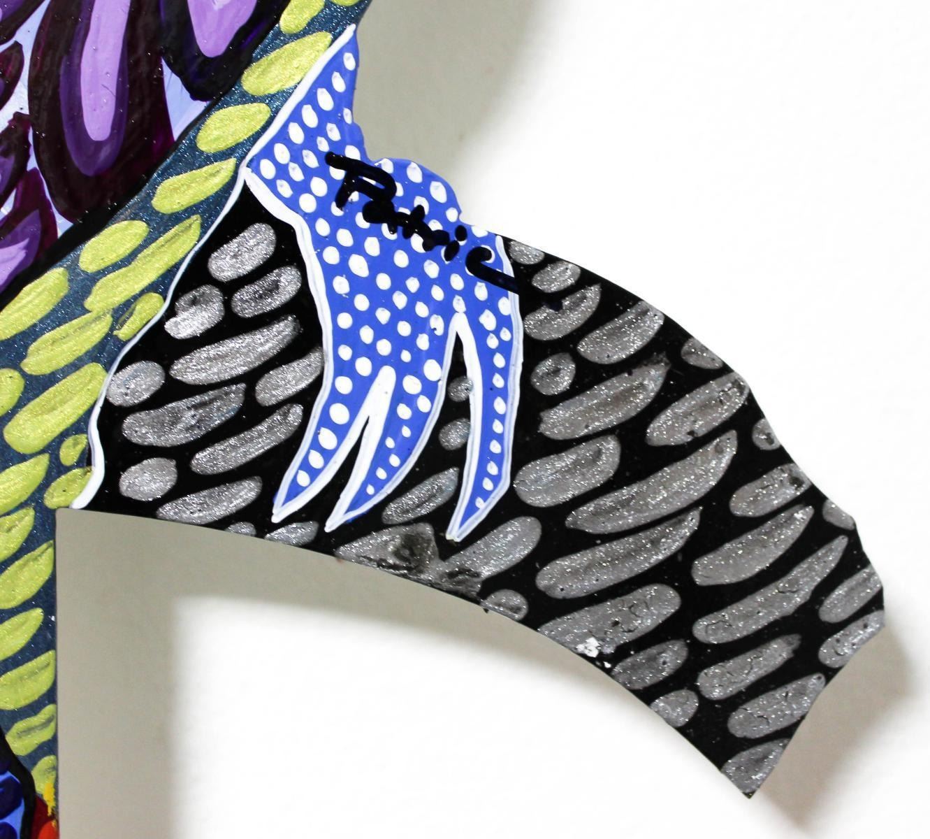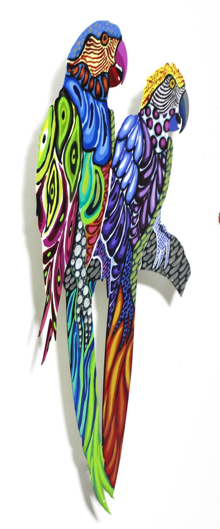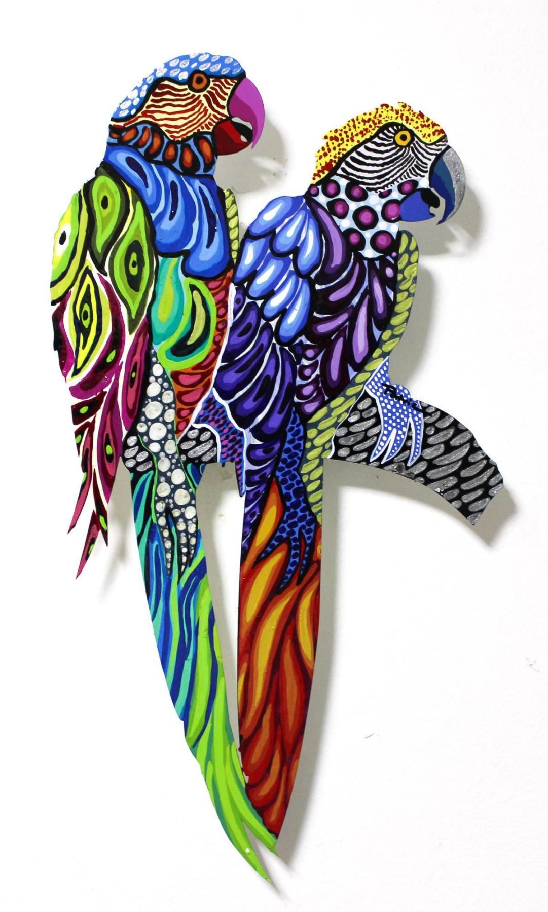 Artist: Patricia Govezensky. Medium: Original Painting on Laser Cut Steel. Title: Two Parrots V. Size (Unframed): 18" x 10". Certificate of Authenticity: From the publisher. Reference# 11916.