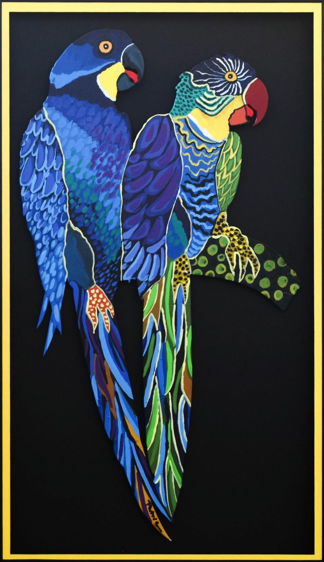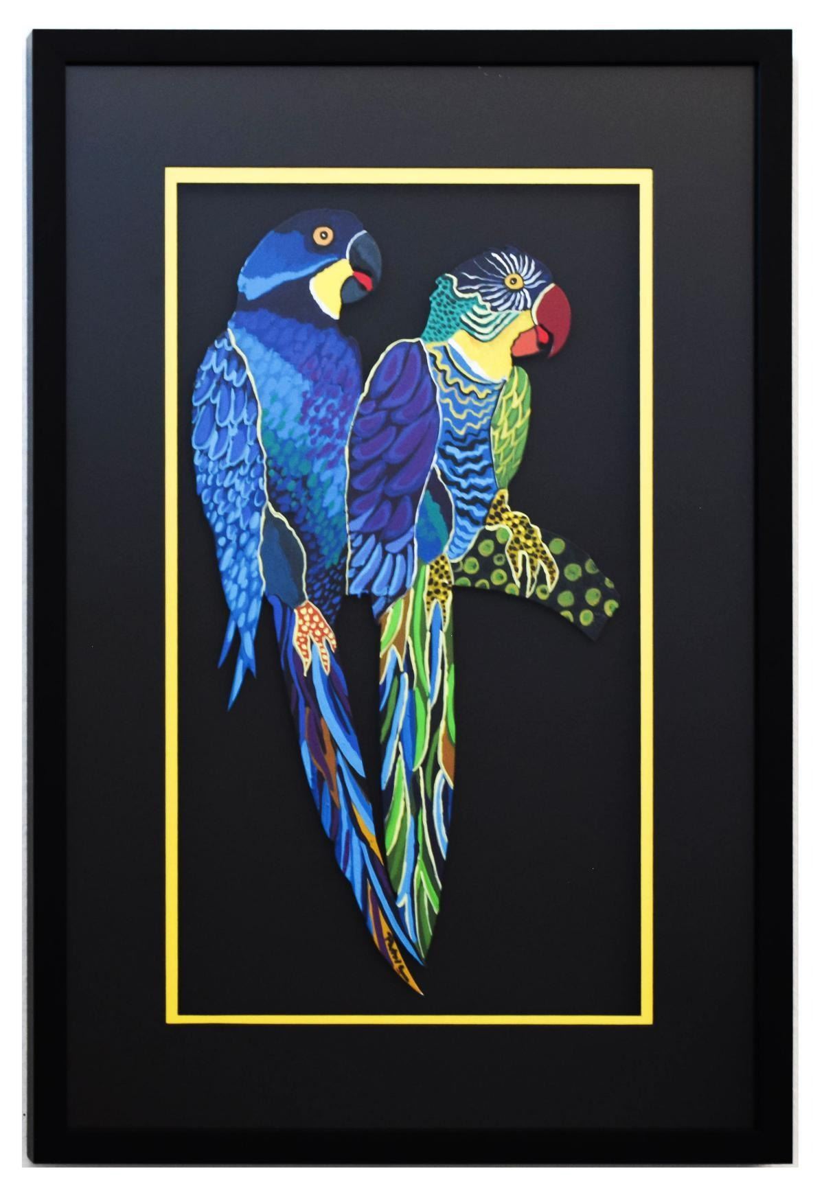 Artist: Patricia Govezensky. Medium: Original Painting on Laser Cut Steel. Title: Two Parrots XII. Size (Unframed): 18.1" x 10". Size (Framed): 25" x 17". Certificate of Authenticity: From the publisher. Reference# 12159.