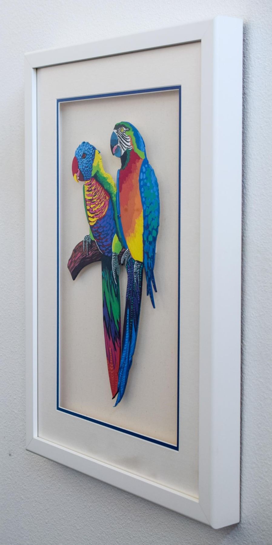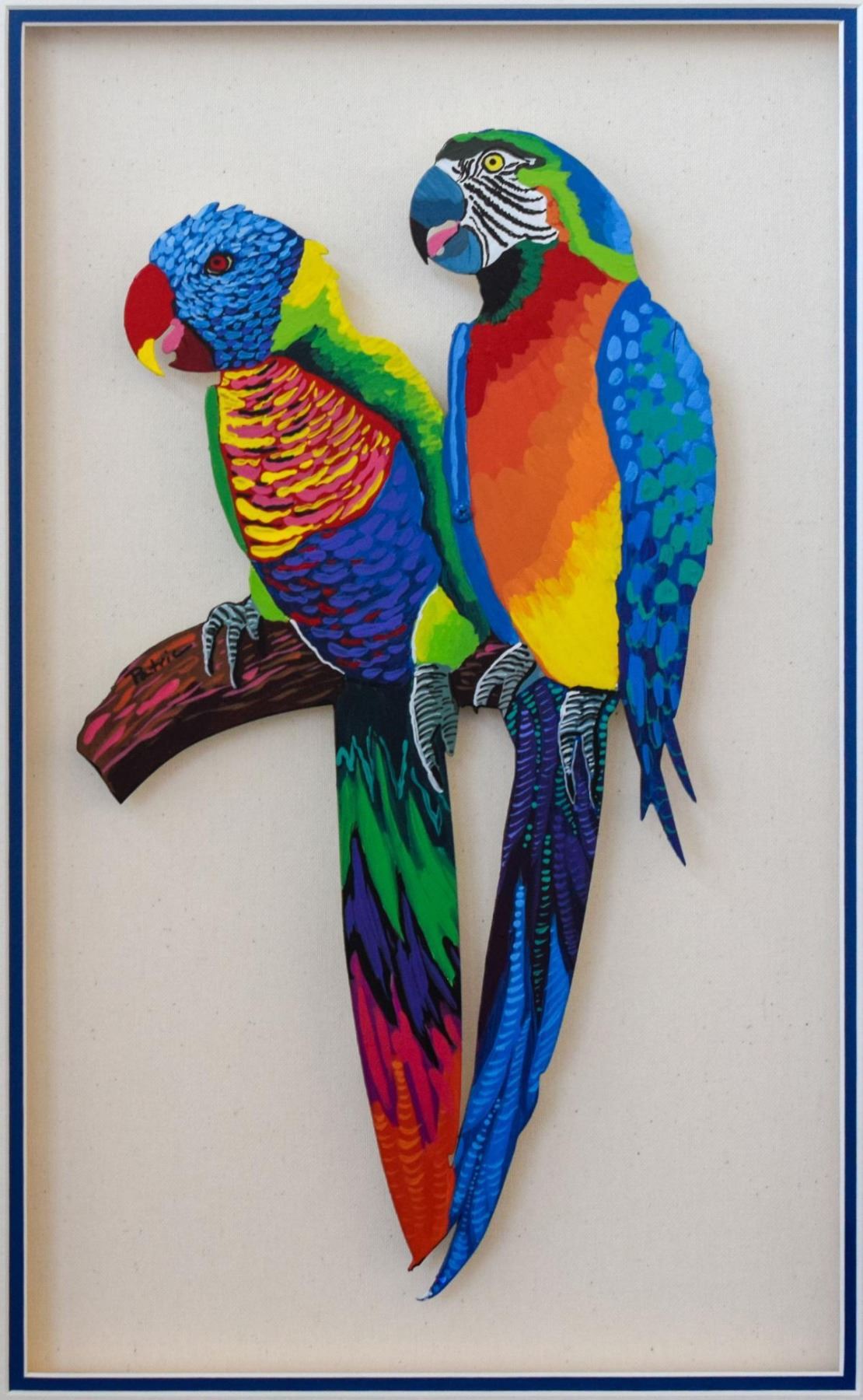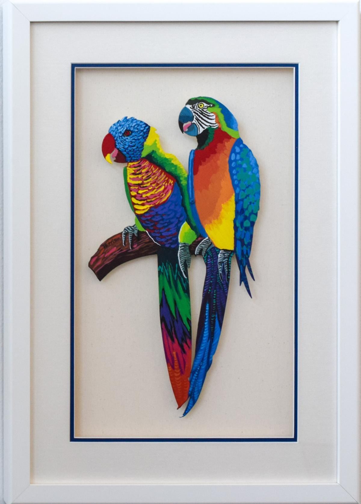 Artist: Patricia Govezensky. Medium: Original Painting on Laser Cut Steel. Title: Two Parrots. Size (Unframed): 18" x 10". Size (Framed): 27.5" x 19.5". Certificate of Authenticity: From the publisher. Additional: Original painting on laser cut steel hand painted by the artist and custom framed. Only one of a kind.. Reference# 11431.