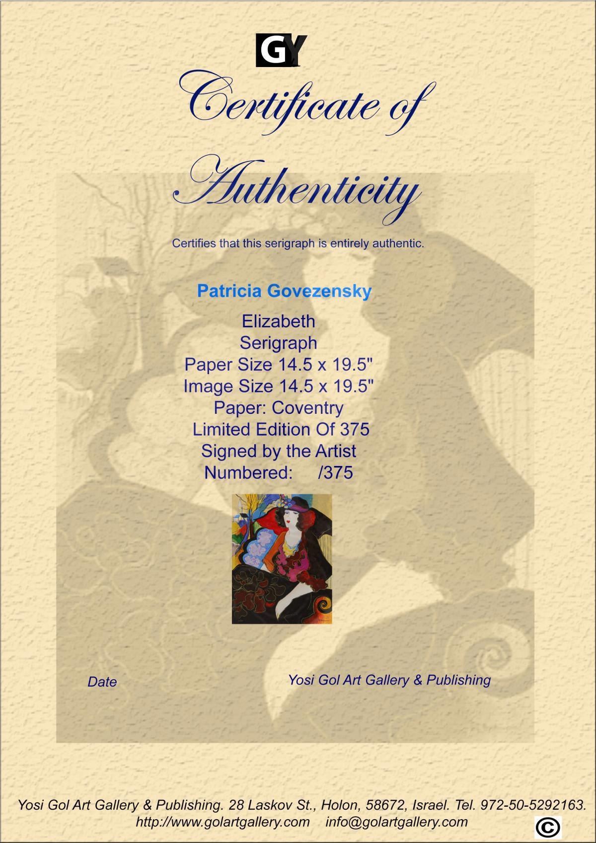 Artist: Patricia Govezensky. Medium: Original Serigraph on Paper. Title: Elizabeth. Size (Unframed): 19.5" x 14.5". Limited Edition: Edition of 375. Certificate of Authenticity: From the publisher.