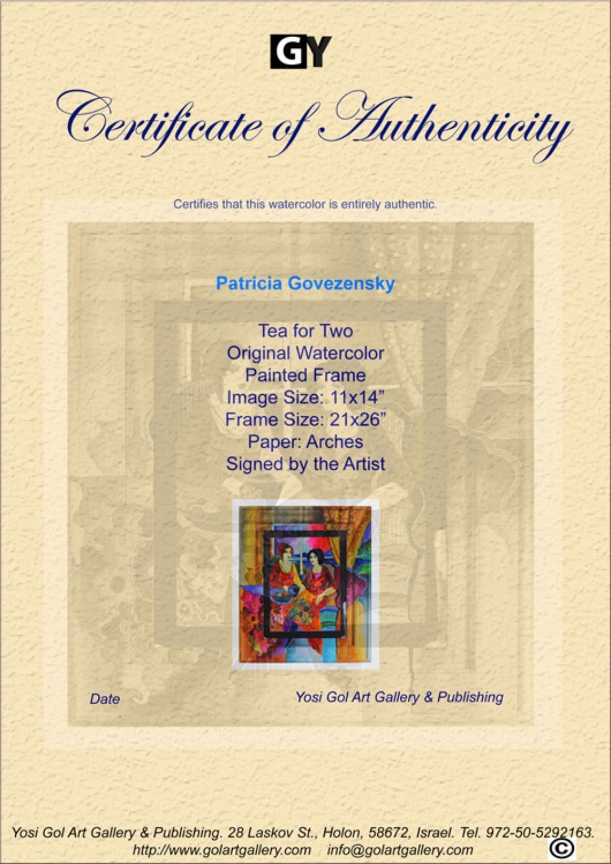 Artist: Patricia Govezensky. Medium: Original Watercolor with Hand Painted Frame. Title: Tea for Two. Size (Unframed): 15" x 11". Size (Framed): 26" x 21". Certificate of Authenticity: From the publisher. Reference# 10266.