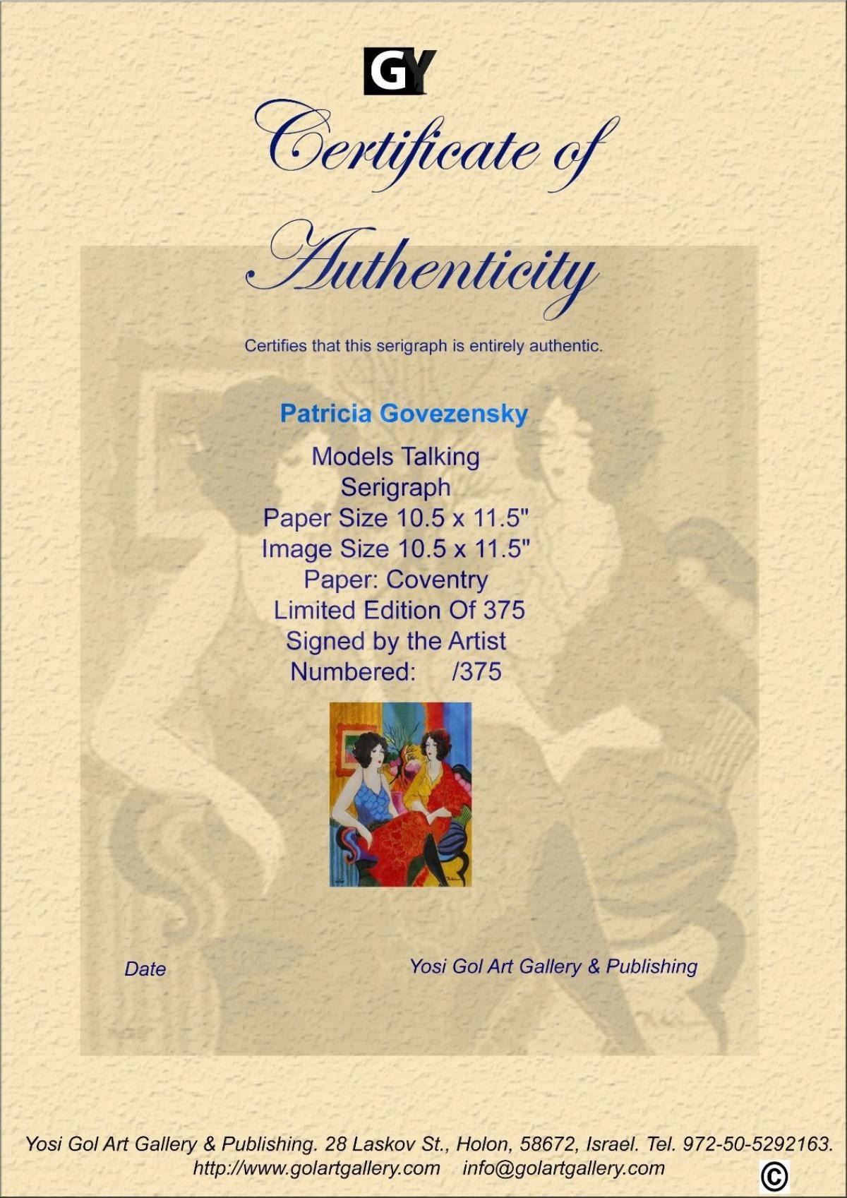 Artist: Patricia Govezensky. Medium: Set of 2 Serigraph on Paper. Title: Noa and Models Talking. Size (Unframed): 11.5" x 10.5". Limited Edition: Edition of 375. Certificate of Authenticity: From the publisher.