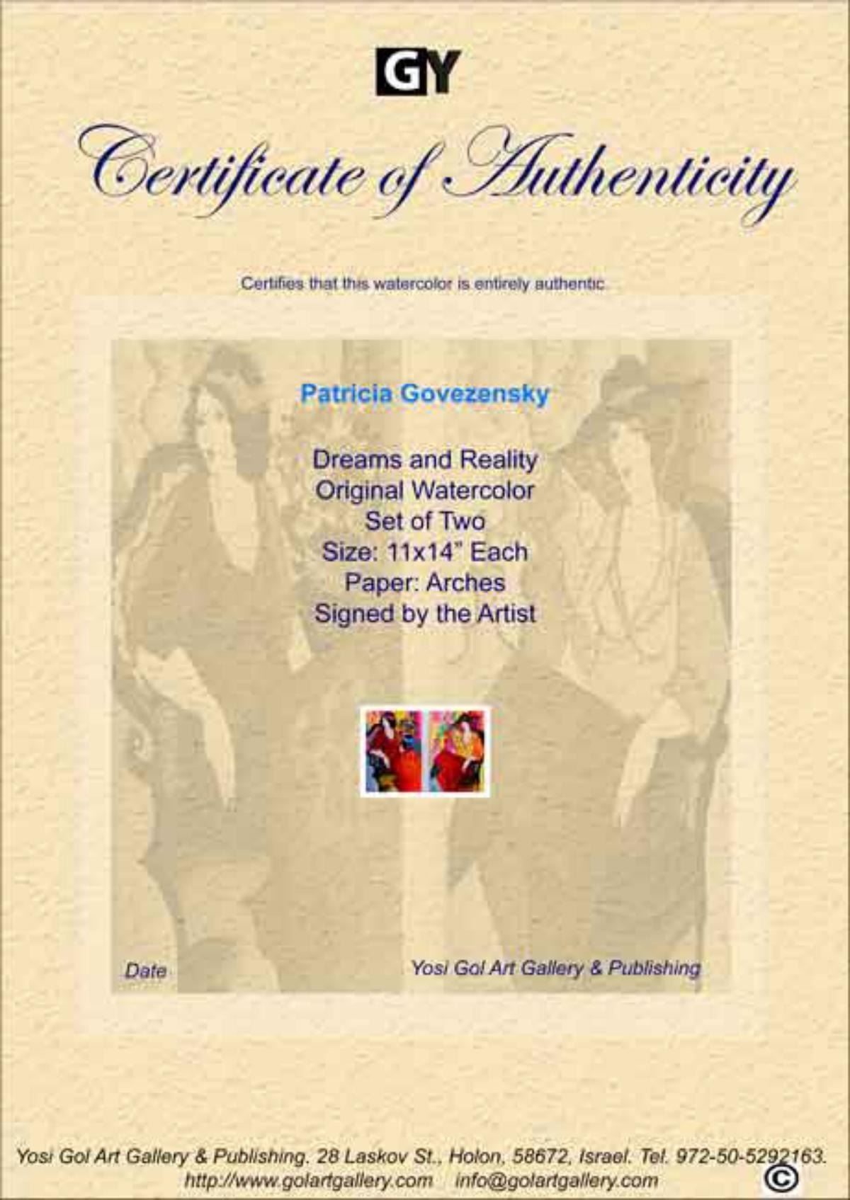 Artist: Patricia Govezensky. Medium: Set of Two Original Watercolors. Title: Dreams and Reality. Size (Unframed): 14" x 11". Certificate of Authenticity: From the publisher. Reference# 10225.