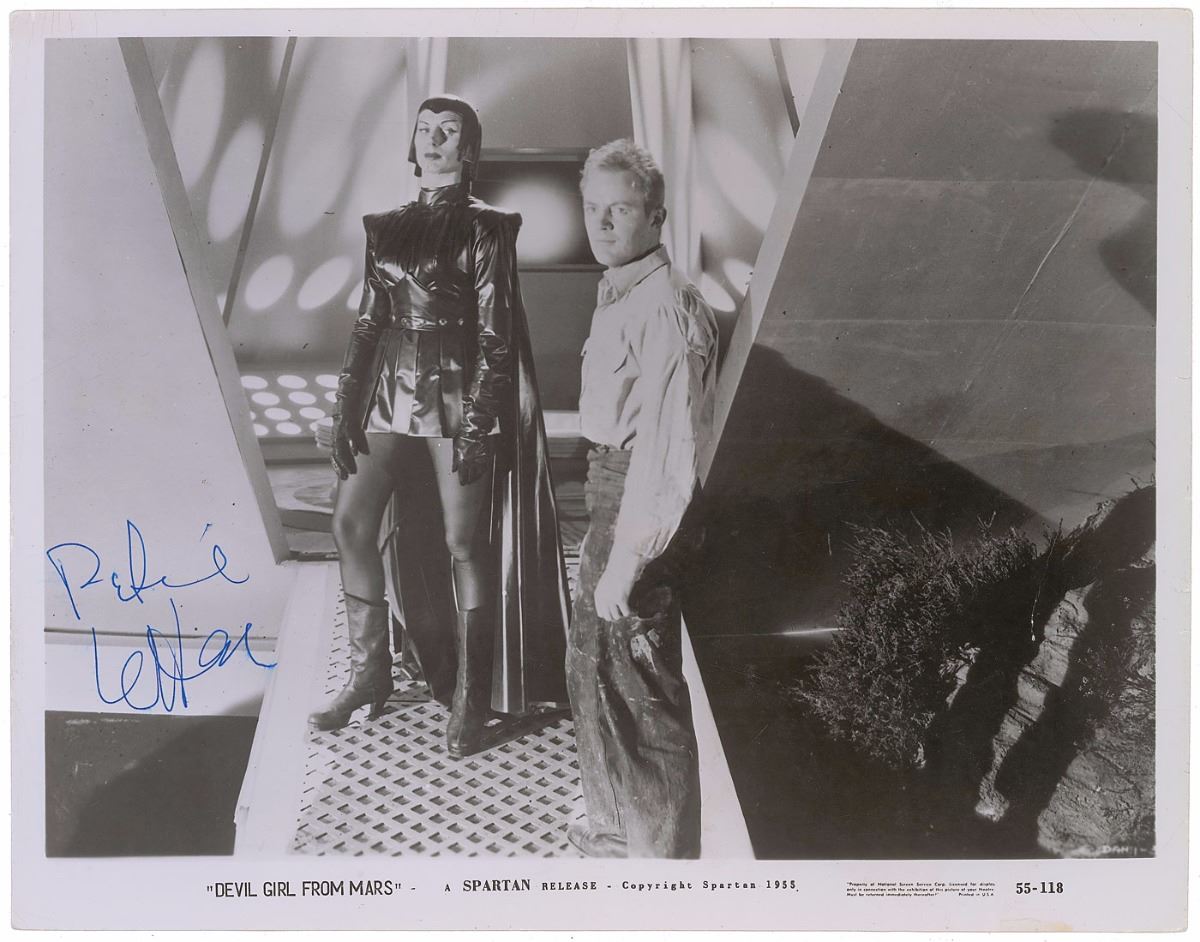 British actress (born 1919) best known for her role in Devil Girl from Mars, one of the first films of its genre produced in the UK. Glossy 10.25 x 8 Spartan publicity photo of Laffan as Nyah in the 1954 film Devil Girl from Mars, signed in blue ink. Slight scattered surface impressions and creasing, and two small tears to right edge, otherwise fine condition.