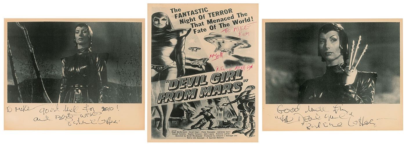 English actress and fashion impresario (1919–2014) best known for her film roles in Quo Vadis and Devil Girl from Mars. Three glossy photos of Laffan in her cult-classic role as Nyah from the 1954 science-fiction film Devil Girl from Mars, 8 x 10 and 10 x 8, each signed and inscribed in ink. In fine condition, with red pen trouble forcing Laffan to retrace her signature several times on the poster image.
