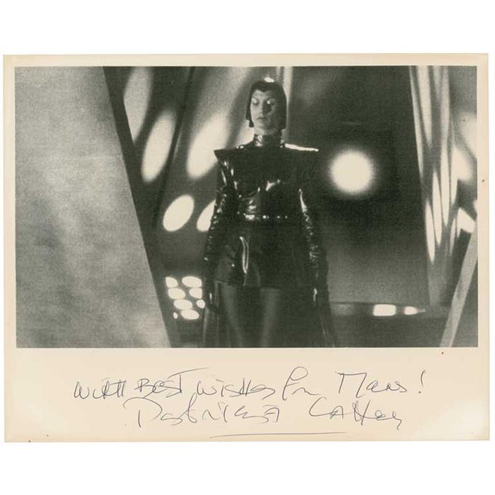 British actress best known for her role as Nyah in Devil Girl from Mars (1954), one of the first films of its genre produced in the UK. Glossy 10 x 8 photo of Nyah from Devil Girl from Mars, signed in the lower border in black ballpoint, “With best wishes from Mars! Patricia Laffan.” In fine condition. Pre-certified PSA/DNA and RRAuction COA.