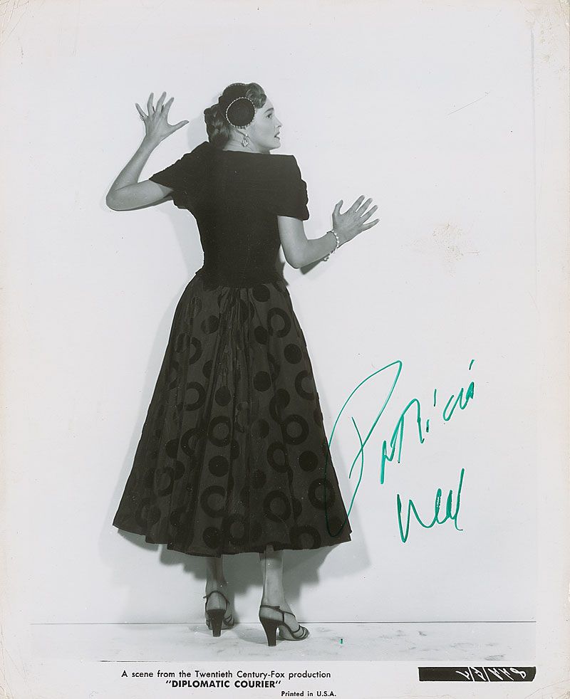 Two different glossy 8 x 10 photos, one a 20th Century Fox promotional photo for Diplomatic Courier, signed in green ink; the other a head-and-shoulders photo signed in silver ink. In fine condition, with some irregular ink adhesion to green ink signature.
