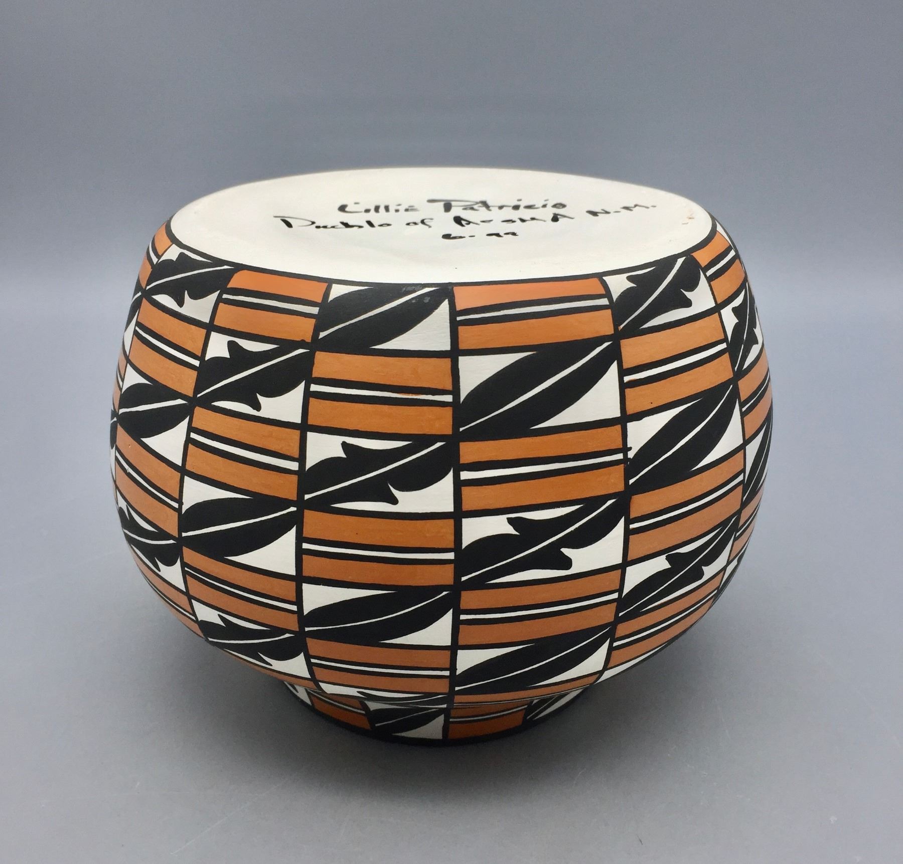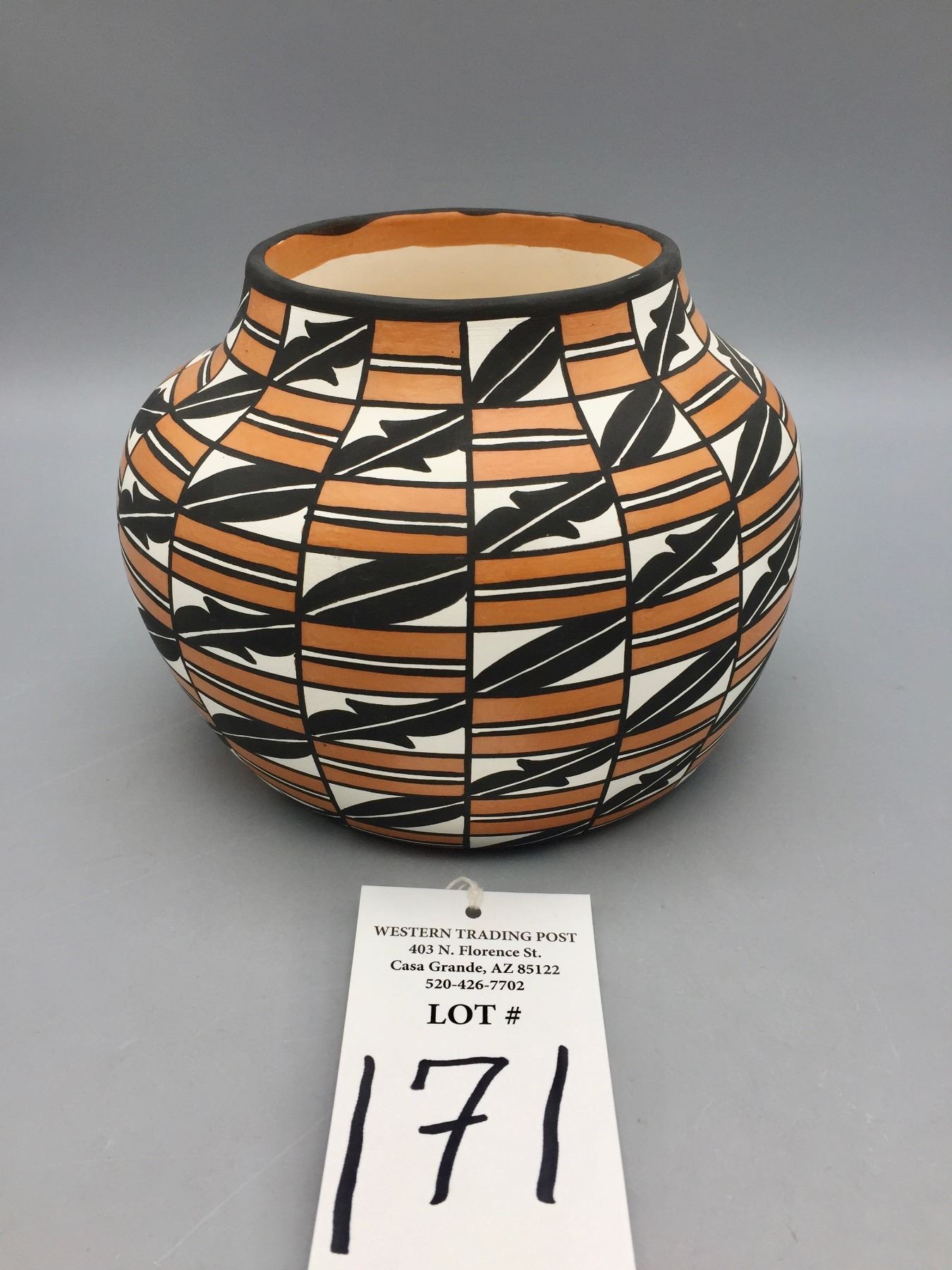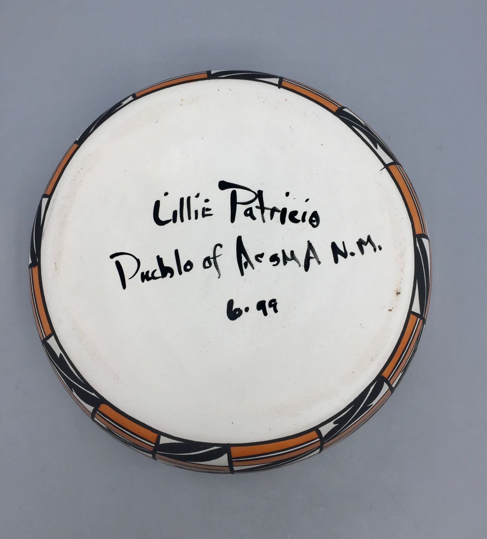 Description: For your collection we offer for sale this beautiful Acoma pot that was handmade and hand painted by Lillie Patricio. Maker: Lillie Patricio, Pueblo of Acoma, NM. Approx. Age: June, 1999. Size: 7”w x 5” tall. Condition: Good for its age, normal wear expected. Please look closely at the pictures - they are an important part of our description. Shipping: There will be a $10 handling / packaging fee for shipping this lot. The actual cost of postage will be added on top of that.