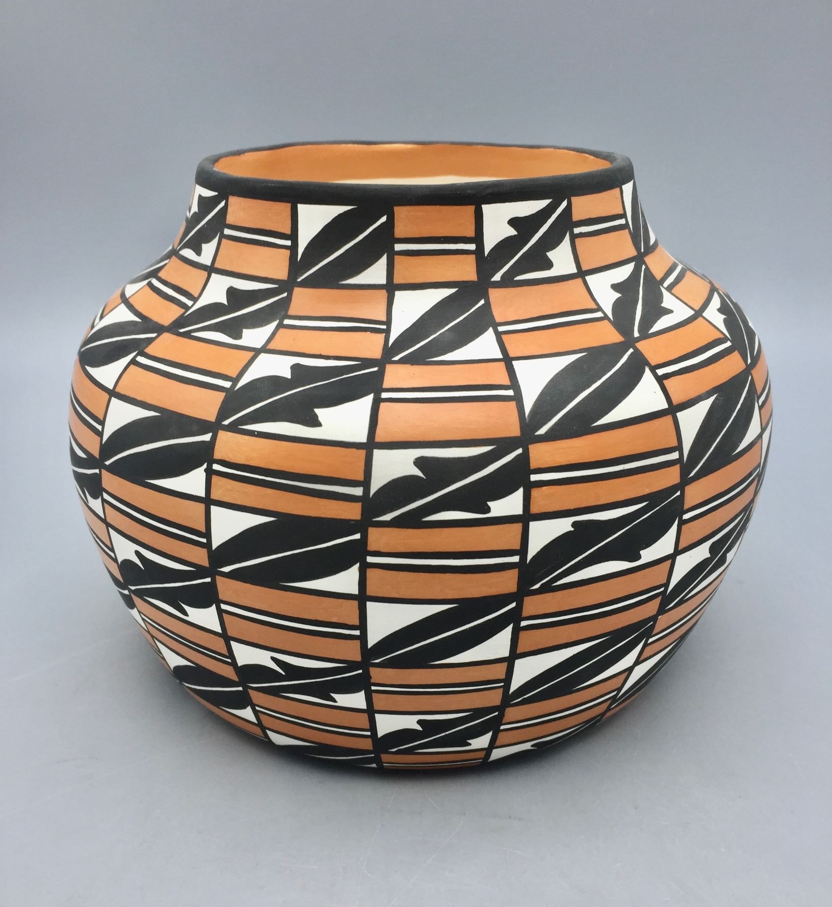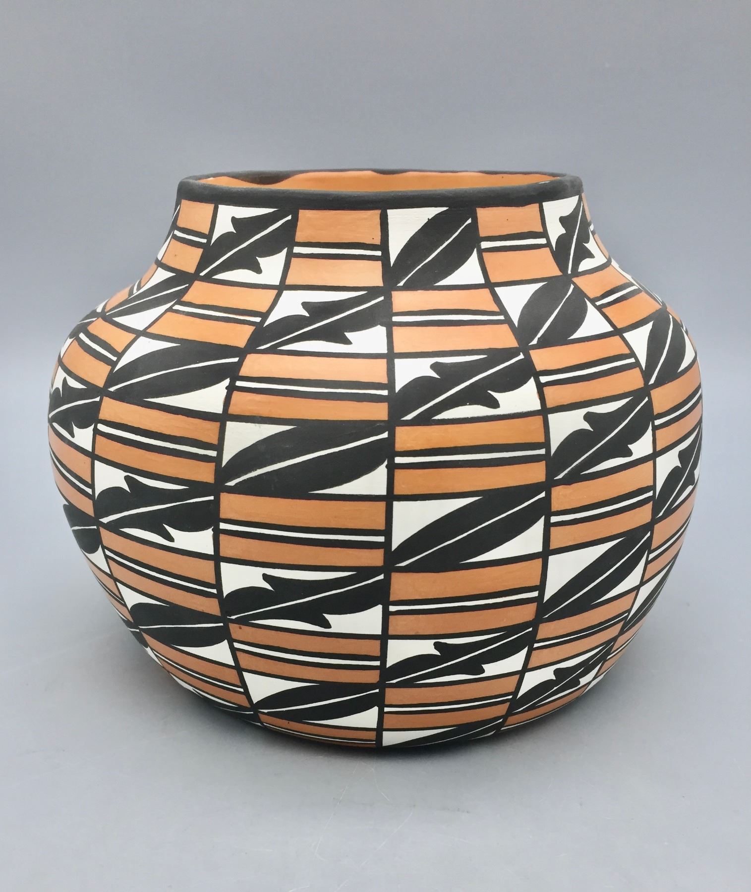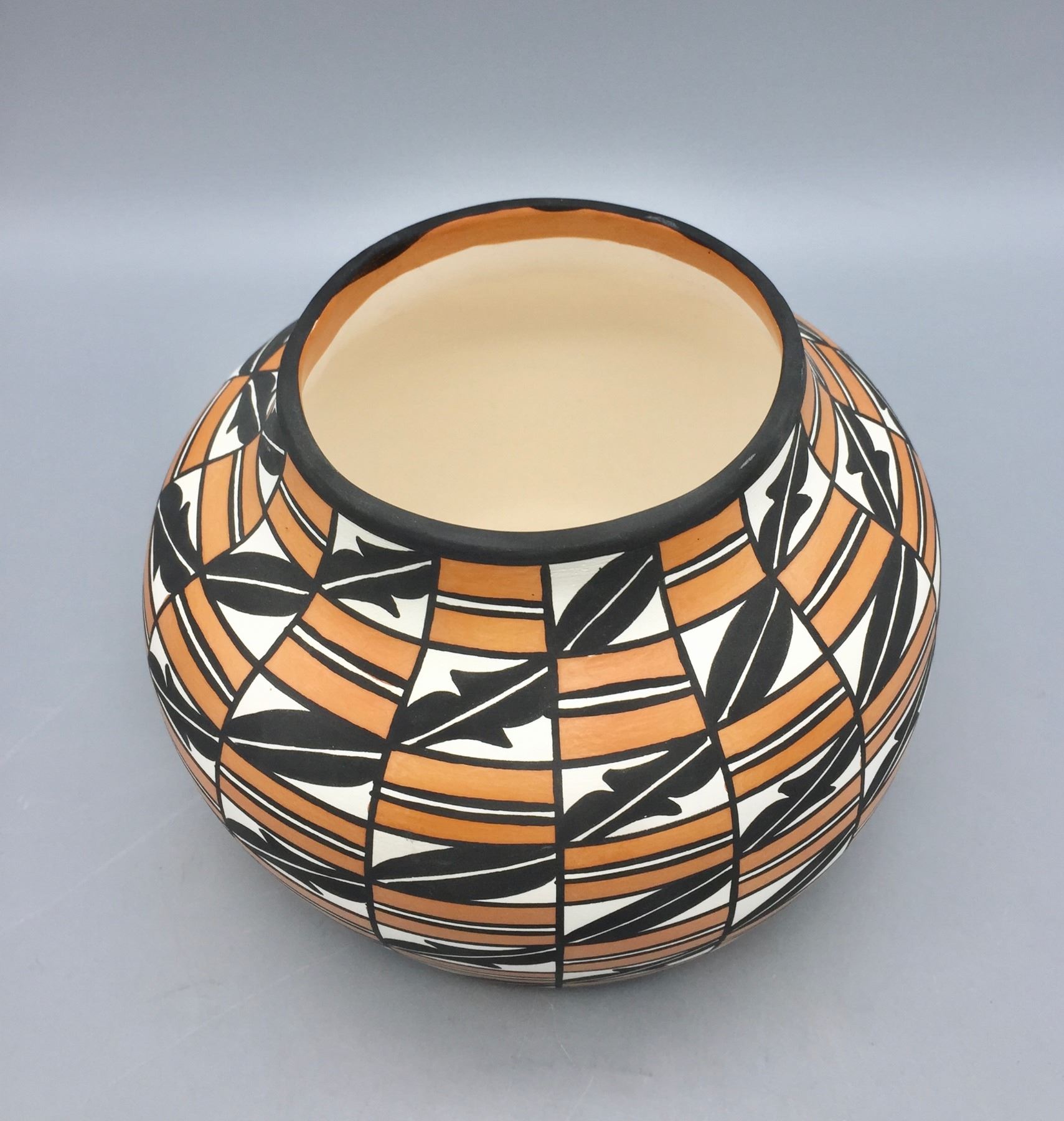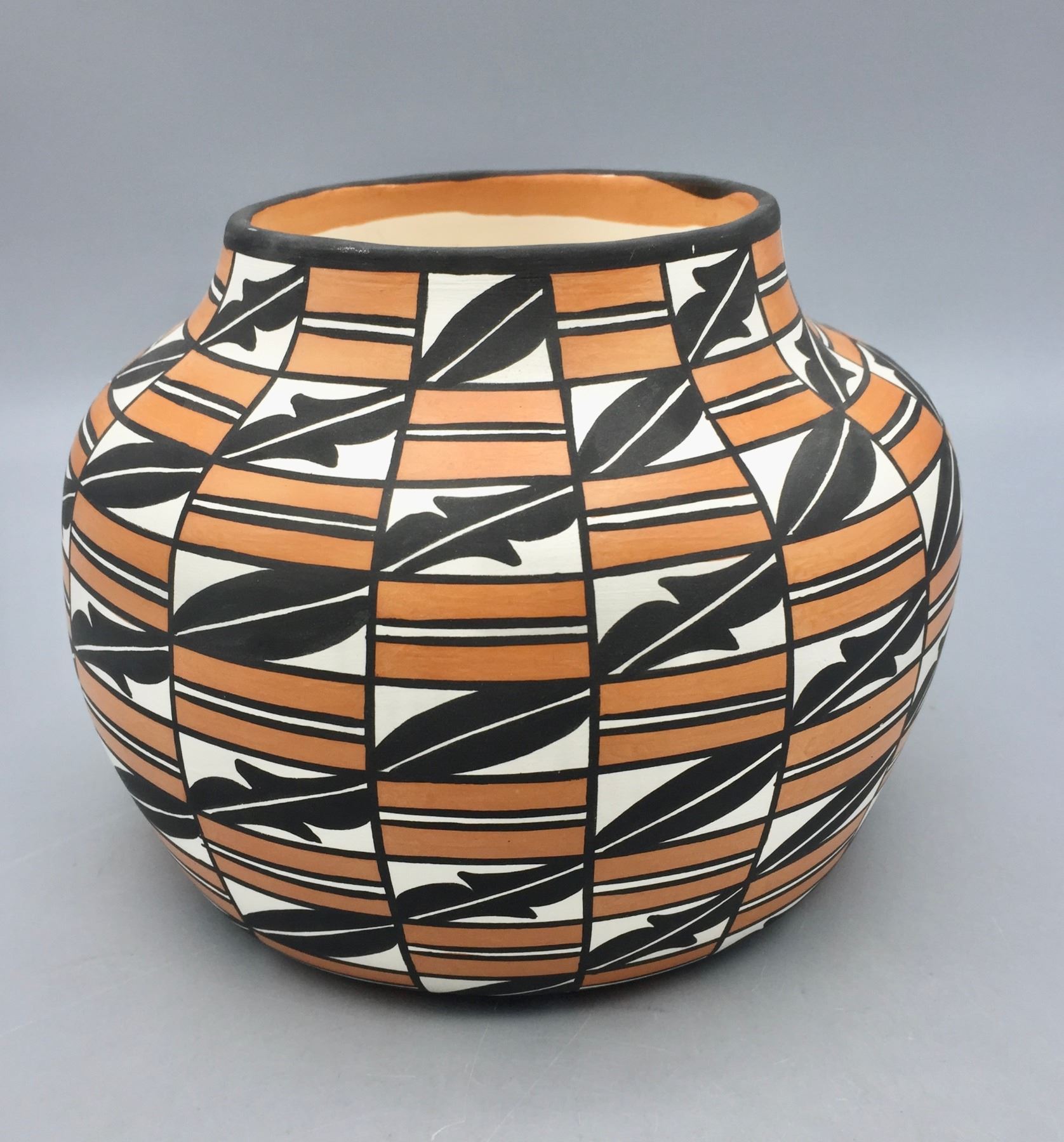 Description: For your collection we offer for sale this beautiful Acoma pot that was handmade and hand painted by Lillie Patricio. Maker: Lillie Patricio, Pueblo of Acoma, NM. Approx. Age: June, 1999. Size: 7”w x 5” tall. Condition: Good for its age, normal wear expected. Please look closely at the pictures - they are an important part of our description. Shipping: There will be a $10 handling / packaging fee for shipping this lot. The actual cost of postage will be added on top of that.