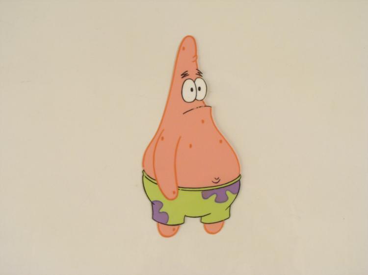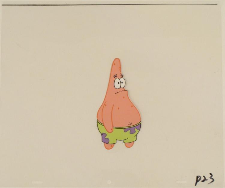 This original animation cel is from the Nickelodeon TV show SpongeBob Squarepants. The story takes place under the deep blue sea in Bikini Bottom, where SpongeBob resides. SpongeBob, who is a yellow, porous sponge, is your typical happy-go-lucky character, as he is always cheerful and enjoys making people laugh. Patrick Star, SpongeBob's neighbor who is a starfish, is your average children's show idiot, as he boasts knowing nothing and is often getting himself into ridiculous situations. Between the homes of these two lies the home of the miserable Squidward, a squid, who is known for being grouchy and playing tricks on SpongeBob and Patrick. Both SpongeBob and Squidward work at the Krusty Krab, a fast food business run by the greedy money-loving Mr. Krabs, a crab, the arch rival of the evil, possibly misunderstood, Plankton. Another neighbor, Sandy Cheeks, an athletic squirrel who normally wears an astronaut's space suit, was introduced in "Tea at the Treedome." She spends most of her time inventing and experimenting. * Patrick is blankly looking forward * Original Production Animated Cel Overall Size of Cel: 10 1/2" x 12 1/2" Very Good Condition This is an original hand-painted cel set-up used in the production of an episode of "SpongeBob SquarePants." Each one-of-a-kind set-up represents a slight change in position of the characters. When individually photographed and projected in rapid succession, the images appear to move. * To create production cels, the original animator's drawing is transferred onto an acetate cel (by hand-inking and/or photo copying). The cel is then hand-painted on the reverse side. * The cel received by the winning bidder may be ever so slightly different from the one in the auction photos. * The cel is ready to be matted and framed. The animator's notations are at the bottom of the cel. There is some slight paint fade to Patrick's outline. *