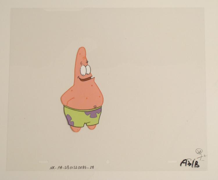 This original animation cel is from the Nickelodeon TV show SpongeBob Squarepants. The story takes place under the deep blue sea in Bikini Bottom, where SpongeBob resides. SpongeBob, who is a yellow, porous sponge, is your typical happy-go-lucky character, as he is always cheerful and enjoys making people laugh. Patrick Star, SpongeBob's neighbor who is a starfish, is your average children's show idiot, as he boasts knowing nothing and is often getting himself into ridiculous situations. Between the homes of these two lies the home of the miserable Squidward, a squid, who is known for being grouchy and playing tricks on SpongeBob and Patrick. Both SpongeBob and Squidward work at the Krusty Krab, a fast food business run by the greedy money-loving Mr. Krabs, a crab, the arch rival of the evil, possibly misunderstood, Plankton. Another neighbor, Sandy Cheeks, an athletic squirrel who normally wears an astronaut's space suit, was introduced in "Tea at the Treedome." She spends most of her time inventing and experimenting. * What is Patrick doing? * Original Production Animated Cel Overall Size of Cel: 10 1/2" x 12 1/2" Very Good Condition This is an original hand-painted cel set-up used in the production of an episode of "SpongeBob SquarePants." Each one-of-a-kind set-up represents a slight change in position of the characters. When individually photographed and projected in rapid succession, the images appear to move. * To create production cels, the original animator's drawing is transferred onto an acetate cel (by hand-inking and/or photo copying). The cel is then hand-painted on the reverse side. * The cel received by the winning bidder may be ever so slightly different from the one in the auction photos. * The cel is ready to be matted and framed. The animator's notations are at the bottom of the cel. * *