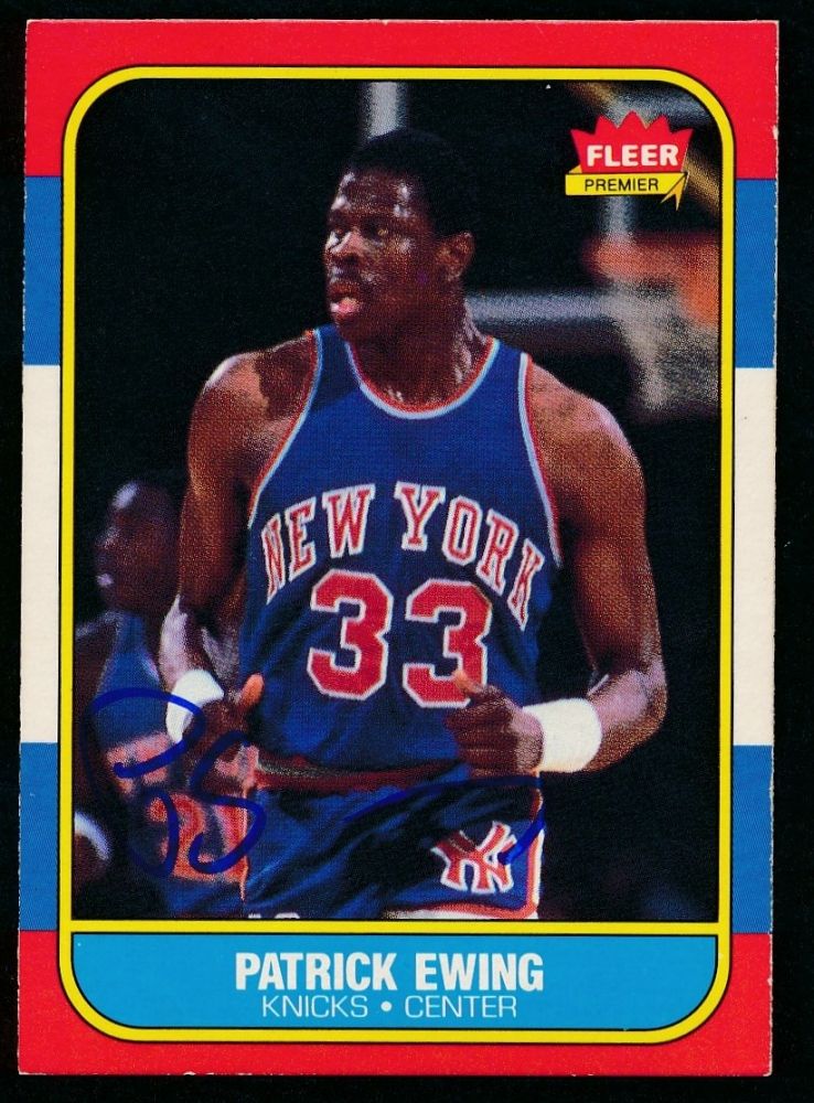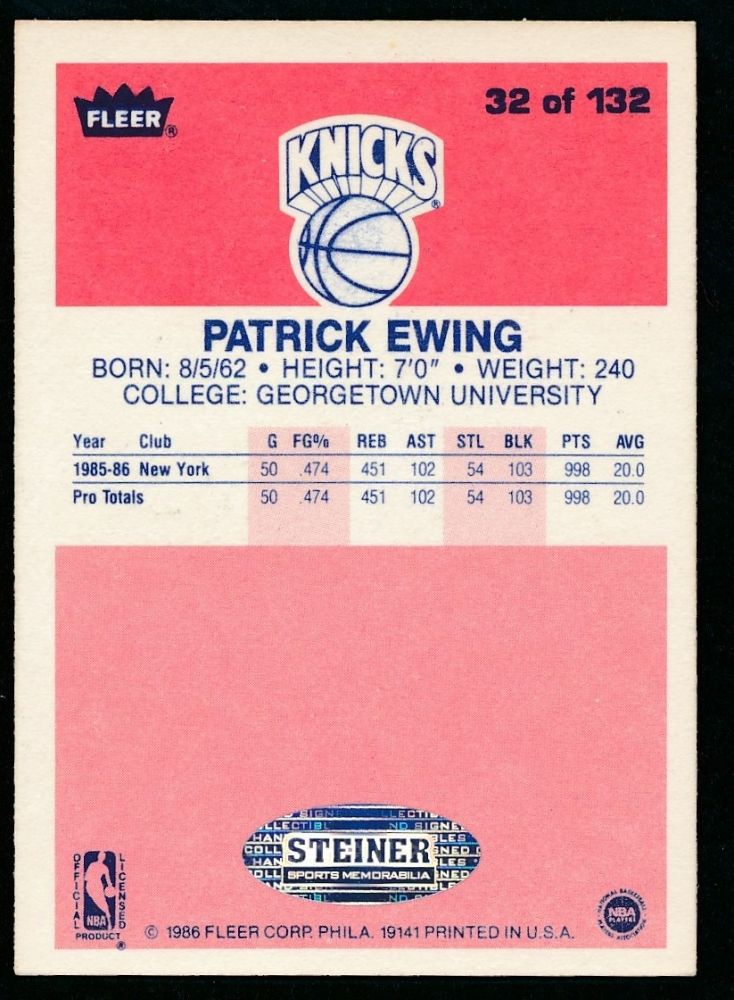 1986-87 Fleer #32 Patrick Ewing Rookie Card hand-signed in blue felt tip pen by Patrick Ewing (Knicks). Please see scan for details regarding the condition of the card. The autograph includes an official Steiner hologram and matching COA for authenticity purposes.