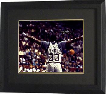 As a freshman during the 1981–1982 season, Patrick Ewing became one of the first college players to start and star on the varsity team as a freshman. While at Georgetown, he developed a habit of wearing a short sleeved T-shirt underneath his sleeveless jersey. This started a fashion trend among young athletes that lasts to this day. In the 1983–84 season, Ewing and Georgetown took the NCAA title with an 84–75 win over the University of Houston. wing was one of the best college basketball players of his era, as Georgetown reached the championship game of the NCAA tournament three out of four years. He was a first-team All-American.Patrick Ewing has hand signed this Georgetown Hoyas 16x20 Photo. Steiner Sports Hologram and Certificate of Authenticity. Custom Black Mat and Premium Black Frame as shown.