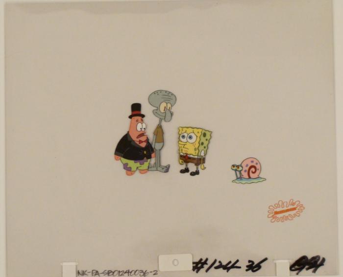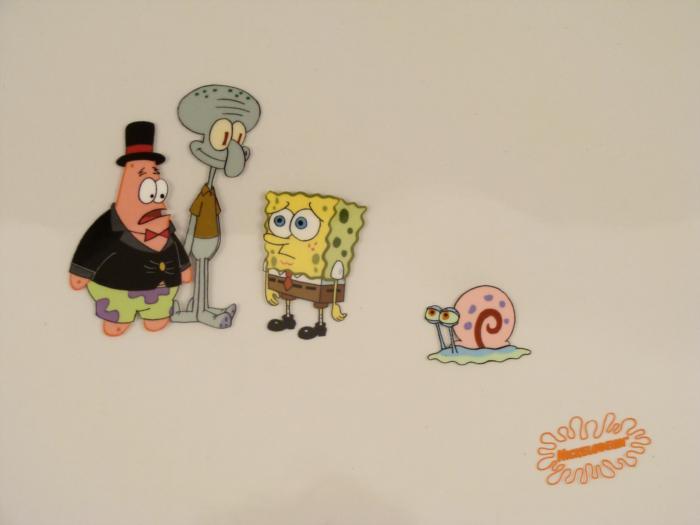 To create production cels, the original animator's drawing is transferred onto an acetate cel (by hand-inking and/or photo copying). The cel is then hand-painted on the reverse side. The cel is ready to be matted and framed. The animator's notations are at the bottom of the cel. The cel has multiple layers; first is Gary, then is Patrick, next is SpongeBob and finally the last cel is Squidward. There is a Nickelodeon TV logo on the bottom right of one of the cels.