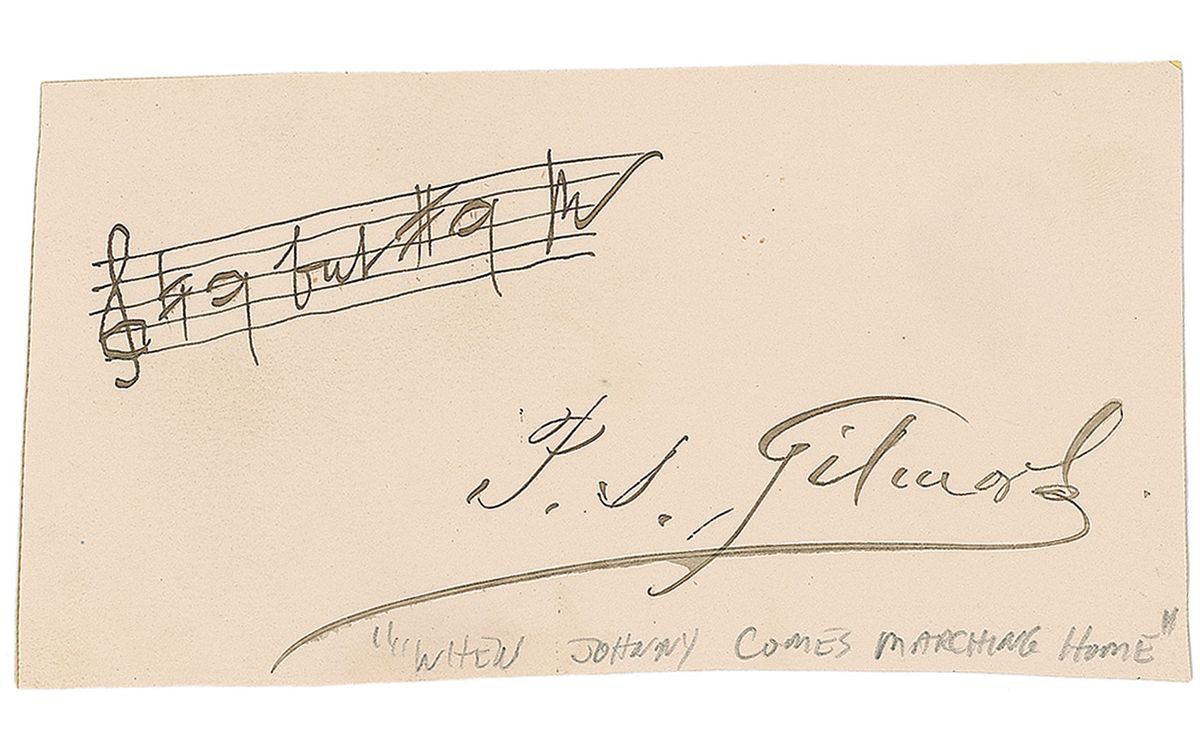 Composer and bandmaster (1829–1892) who served in the Union Army, during which time he famously wrote ‘When Johnny Comes Marching Home.’ AMQS on an off-white 4.5 x 2.5 slip, signed at the conclusion in ink, “P. S. Gilmore.” Gilmore pens a few notes from one of his works. In fine condition.