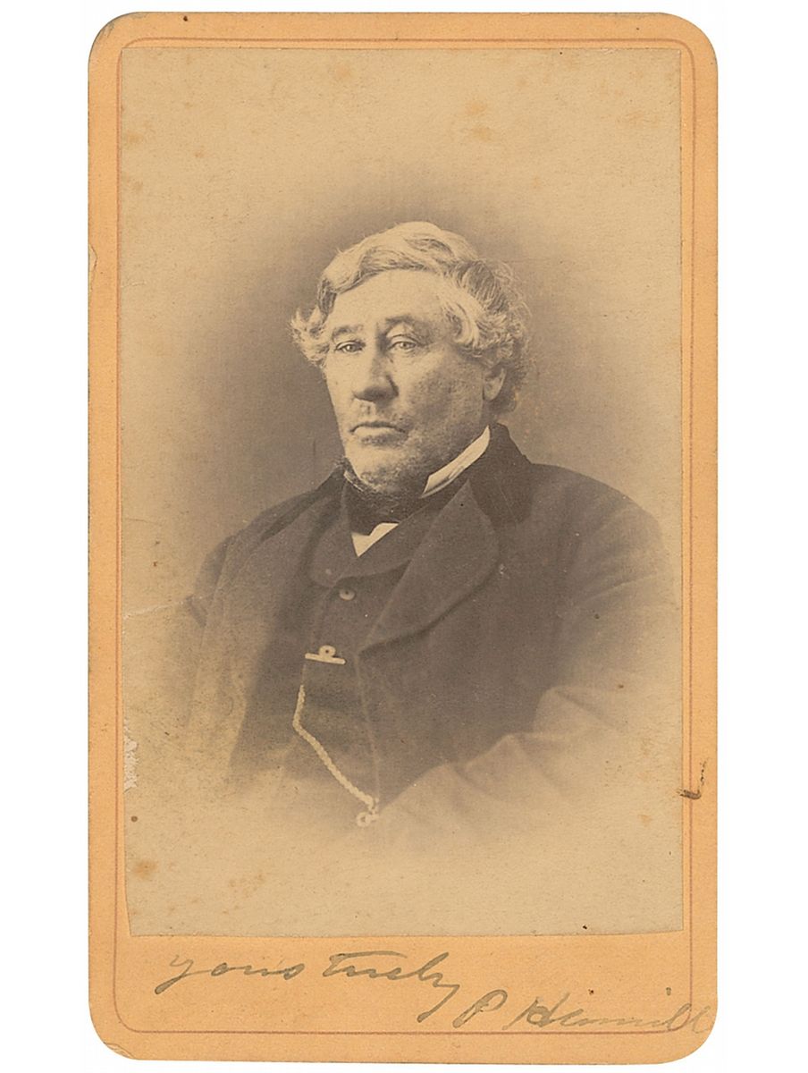 Politician (1817–1895) who served as congressman from Maryland from 1869 to 1871. Original 2.5 x 4 carte-de-visite portrait by an anonymous studio, signed in the lower border in black ink, “Yours truly, P. Hamill.” Scattered wrinkles and light foxing to the image, otherwise fine condition.