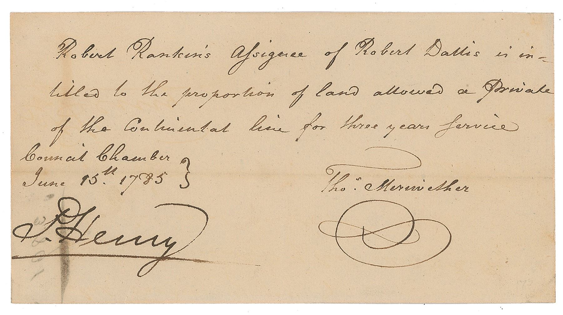Manuscript DS, signed “P. Henry,” one page, 7.25 x 3.75, June 15, 1785. Legal document concerning a land grant, in part: "Robert Ranken's Assignee of Robert Dallis is intitled to the proportion of land allowed a Private of the Continental line for three years Service." Signed at the conclusion by Thomas Meriwether, and boldly countersigned in the lower left by Henry as governor of Virginia. Affixed to a same-size sheet and in fine condition.