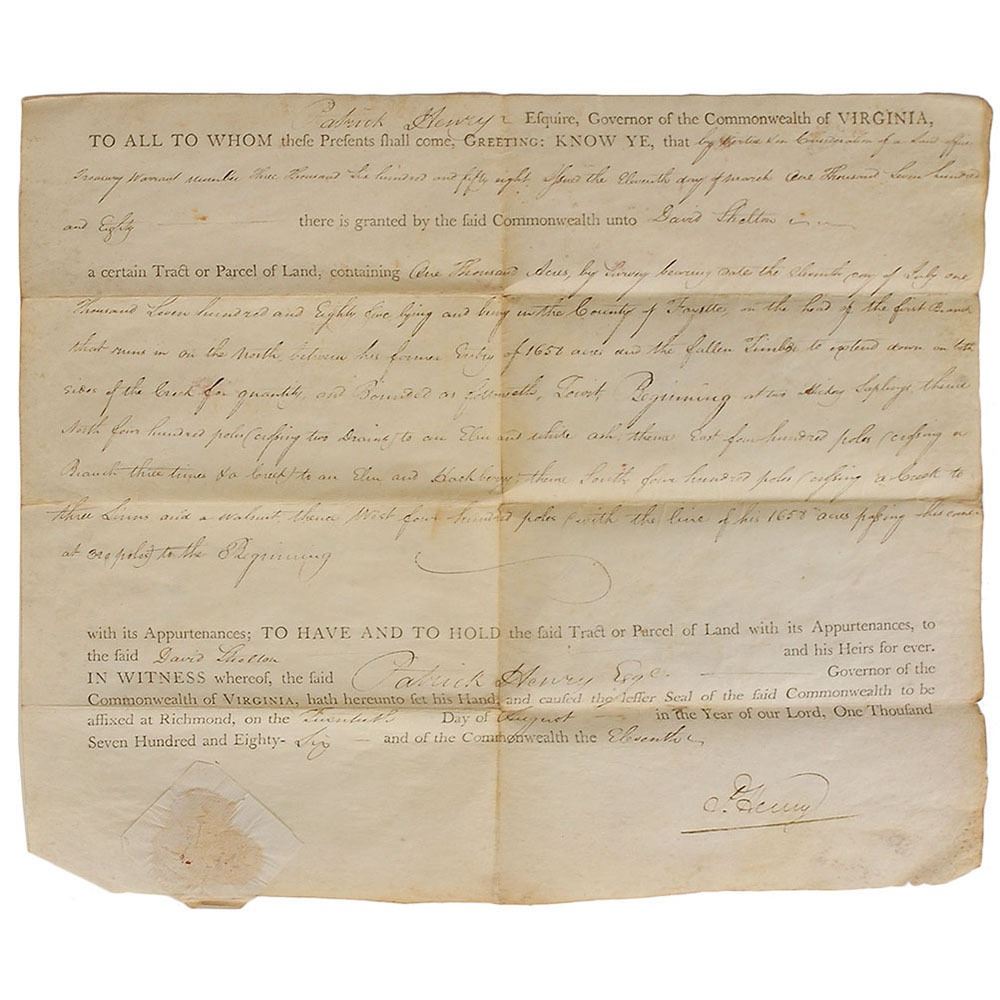 Partly-printed vellum DS, signed “P. Henry,†one page, 15 x 13, August 20, 1786. As governor of Virginia, Henry grants "unto David Shotton a certain Tract or Parcel of Land, containing One Thousand Acres…being in the County of Fayette." Boldly signed at the conclusion by Patrick Henry. The white paper seal affixed to the lower left remains intact. In fine condition, with scattered light toning and tiny areas of loss at fold intersections. Accompanied by an engraved portrait bearing a facsimile signature.