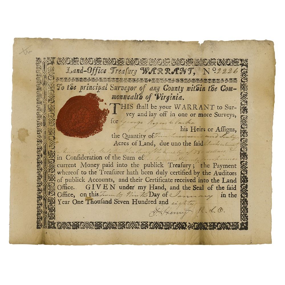 Revolutionary War-dated partly-printed DS, signed “P. Henry,†one page, 8.25 x 6.5, January 29, 1780. A Land-Office Treasury warrant, No. 2226, which reads: "This shall be your warrant to Survey and lay off in one or more Surveys for George Rogers Clark, his Heirs or Assigns, the Quantity of Five hundred and Sixty Acres of Land, due unto the said Clark interest for Recruiting his Batalion & in lieu of the County of 750 dollars & in Consideration of the Sum of Two hundred & twenty four pounds current Money paid into the publick Treasury." Signed at the conclusion by Patrick Henry. Retains the original red wax seal. In very good to fine condition, with toning along the vertical folds.