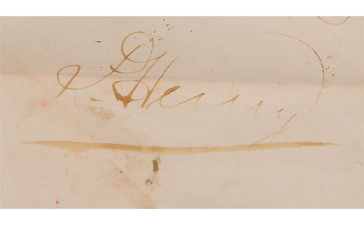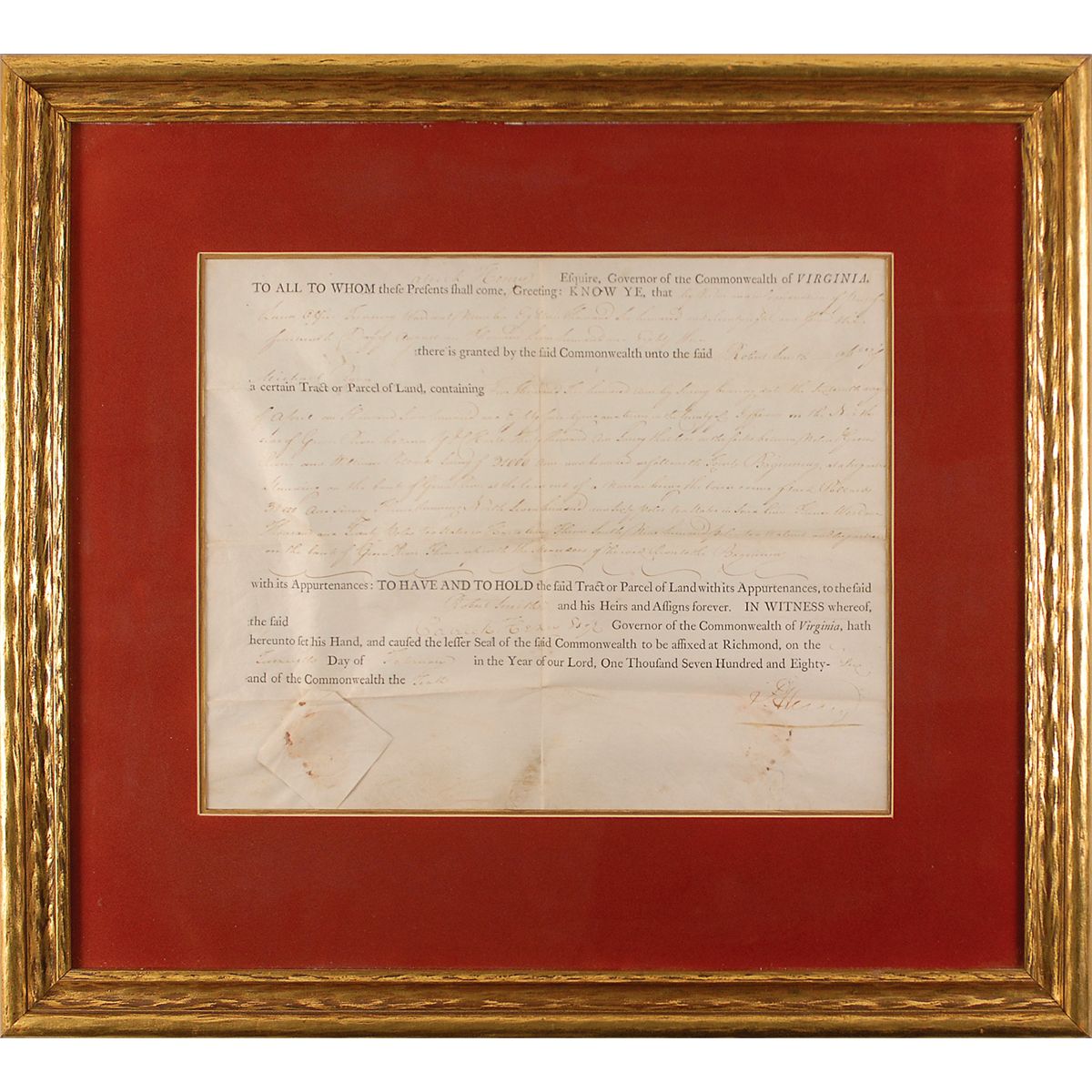 American patriot (1736–1799) best remembered for his stirring, historic declaration, ‘Give me liberty or give me death.’ Partly-printed DS, signed “P. Henry,” one page, 14.25 x 11.75, February 20, 1786. Henry, as governor of Virginia grants Robert Smith a 5200 acre tract of land in Jefferson County, Virginia. Signed at the conclusion by Henry. Matted and framed so both sides may be viewed, to an overall size of 23 x 21. In very good condition, with intersecting folds, with a horizontal fold passing through signature, scattered soiling and creasing, some light toning, slight surface rubbing to a couple of spots, and a few tiny holes of paper loss. The white seal is toned and slightly worn, but intact. Oversized.