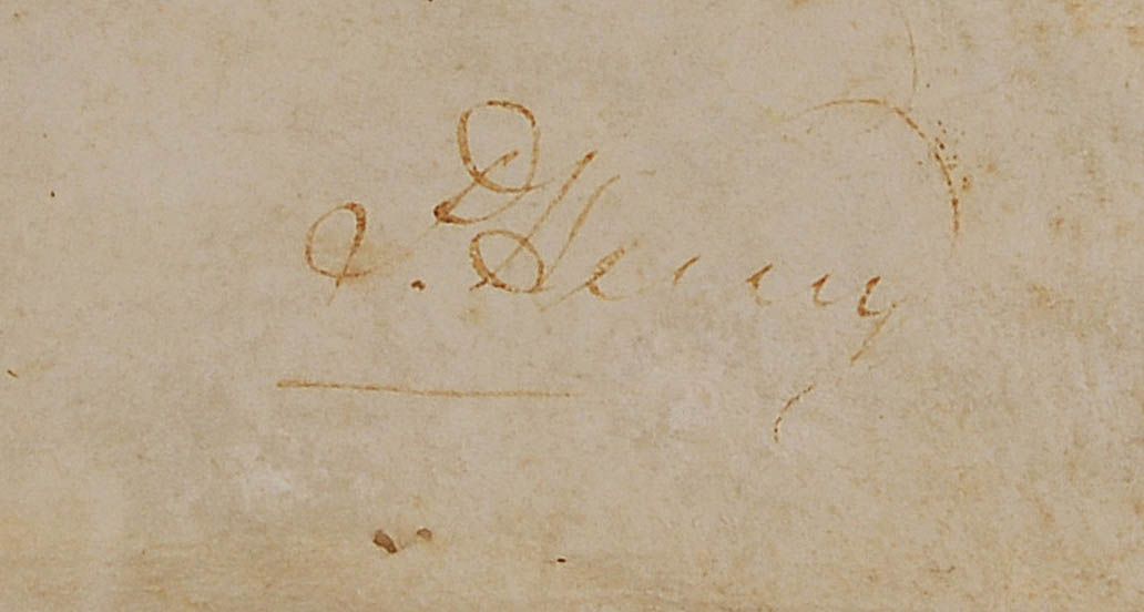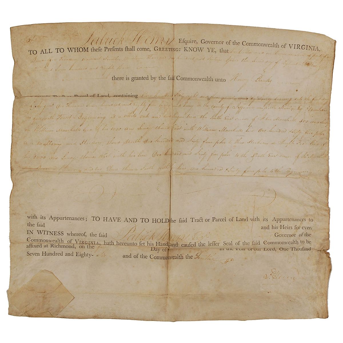 Partly-printed vellum DS, signed “P. Henry,” one page, 14 x 13, June 1, 1786. Land grant issued to Henry Banks, signed at the conclusion by Henry during the last year of his last term as governor of Virginia. In good condition, with heavy intersecting folds, scattered creases, and handwritten text and signature fairly light, but still mostly legible. The paper seal affixed to the lower left corner is worn but intact.