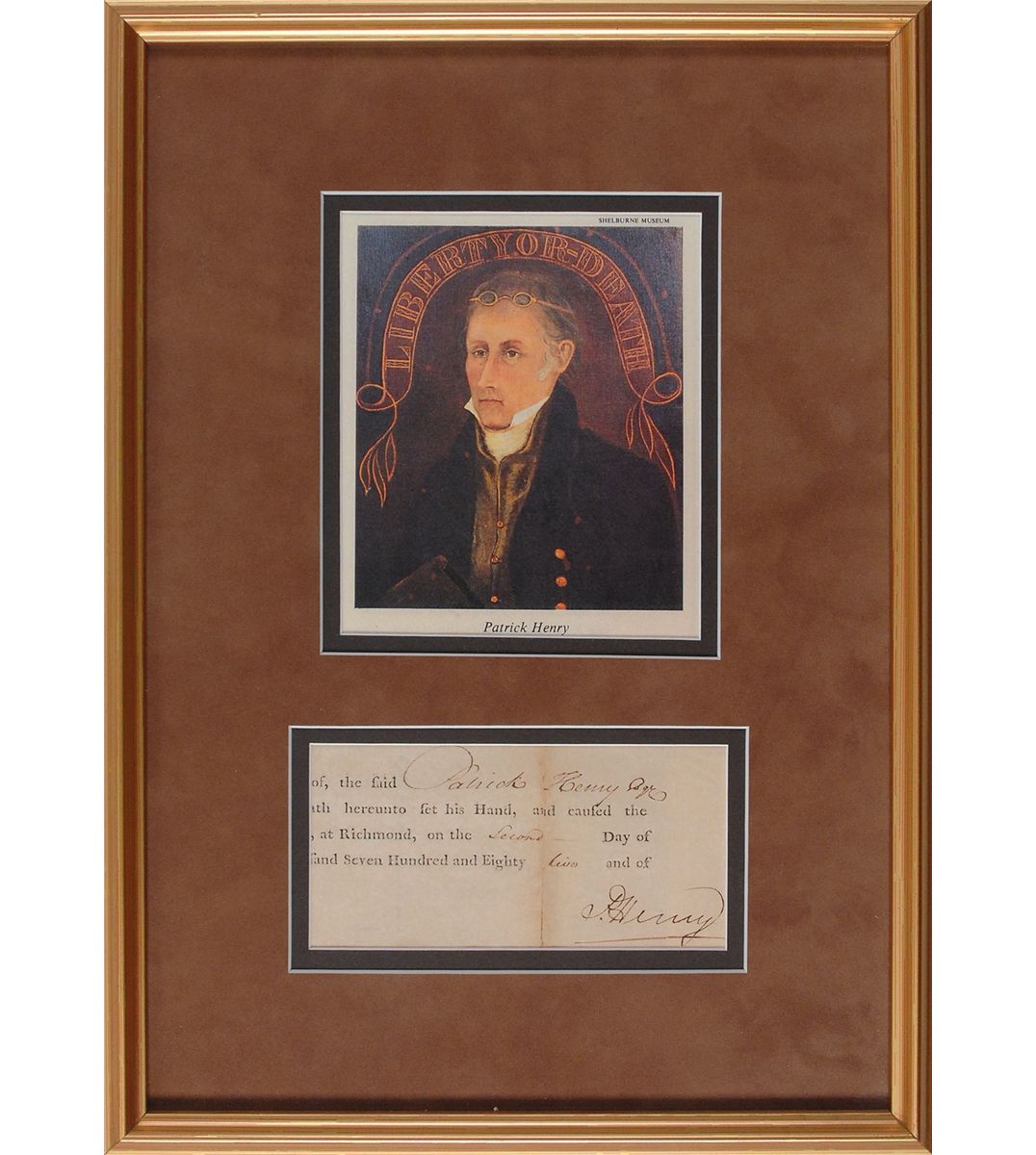 Bold ink signature, “P. Henry,” on an off-white 6 x 3 clipped portion of a document, signed as governor of Virginia, dated 1785. Double-suede-matted and framed with a color print of Henry to an overall size of 12 x 17. In fine condition, with a vertical fold to left of signature.