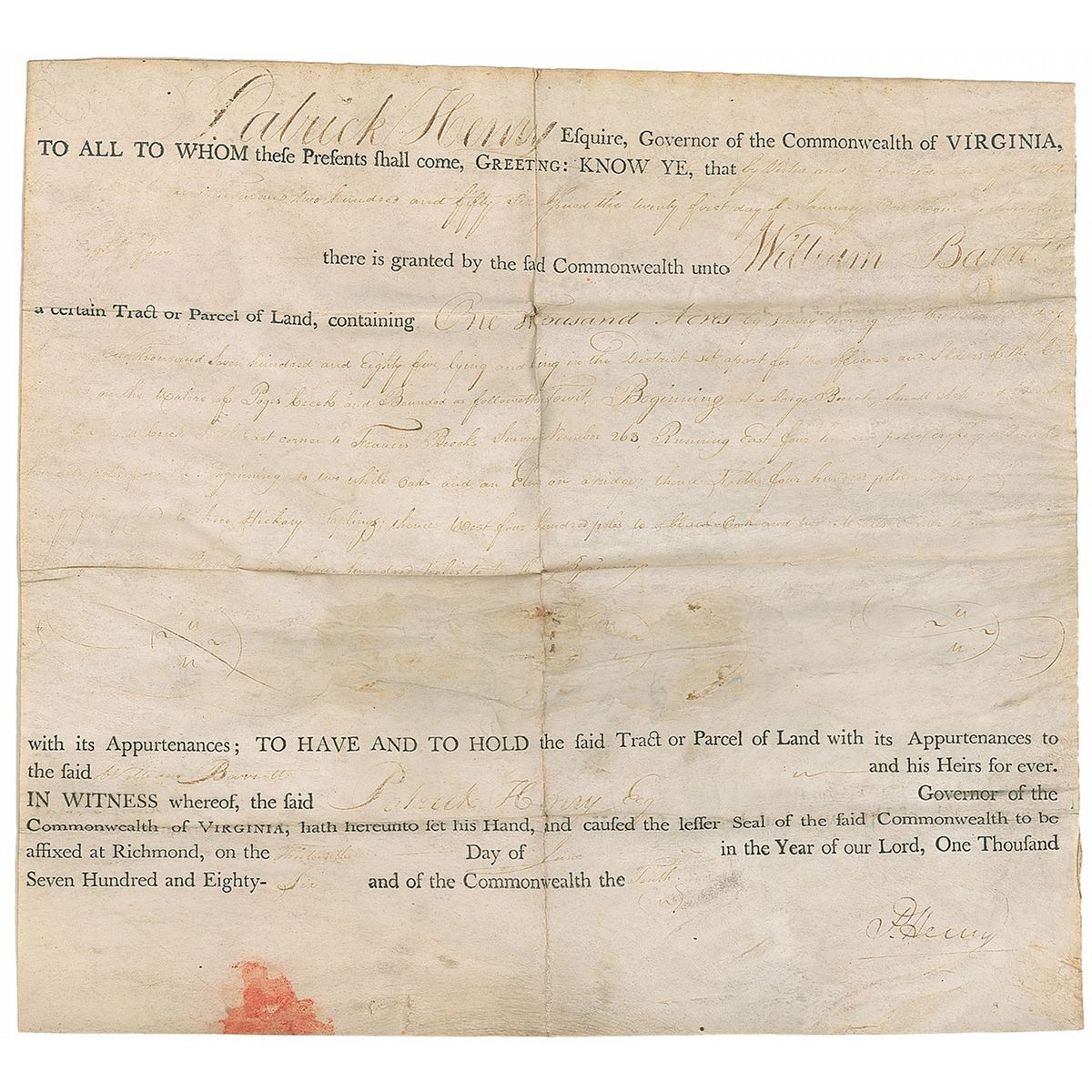 Partly-printed DS, signed “P. Henry,” one page, 13.5 x 12.25, June 13, 1786. Governor Henry grants 1000 acres of land in Virginia to William Barre. In very good condition, with slightly trimmed edges, written portions of document extremely light and partially legible, intersecting folds, mild rippling, and Henry’s signature a few shades light, but still completely legible.