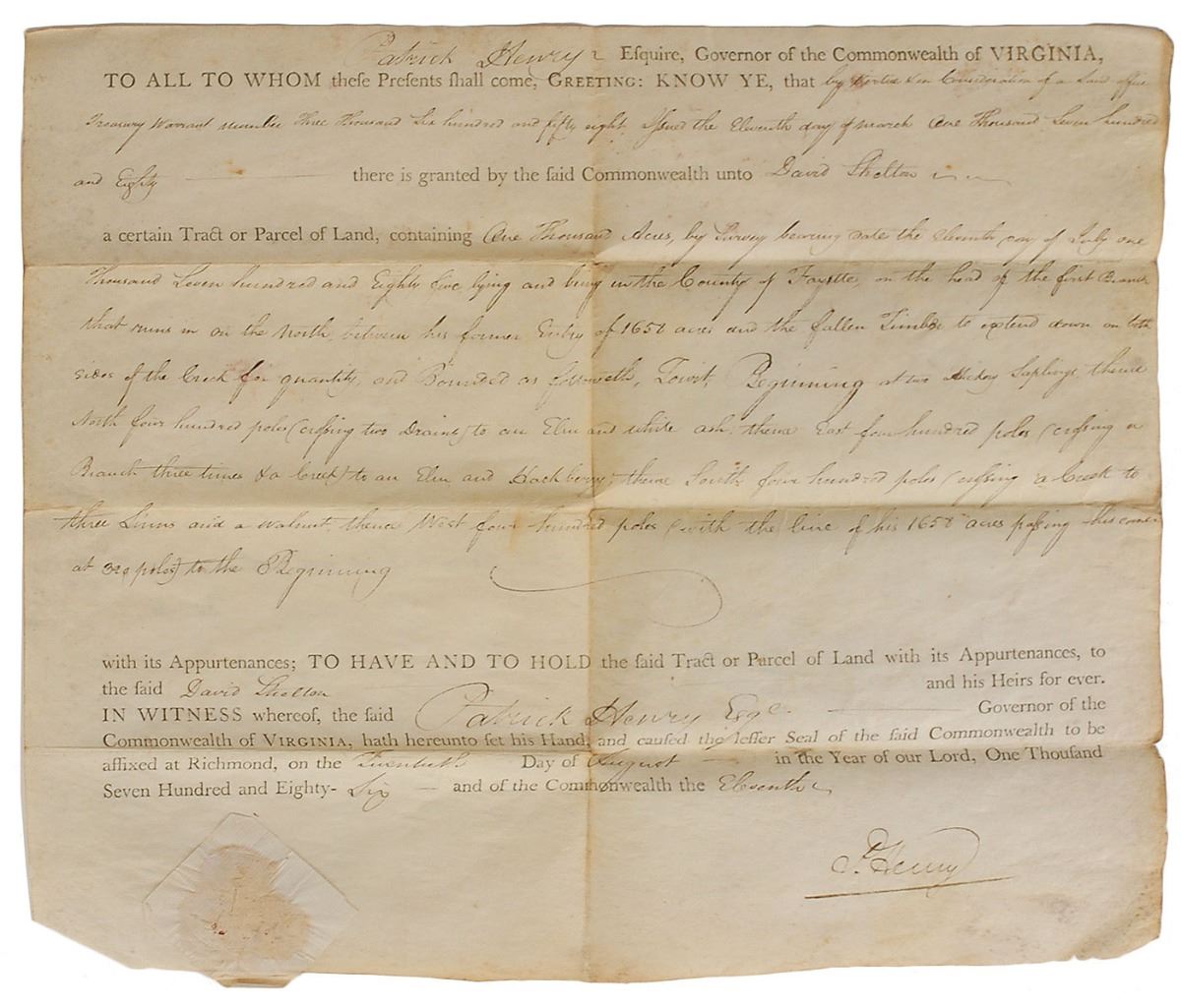 Partly-printed vellum DS, signed “P. Henry,” one page, 15 x 13, August 20, 1786. As governor of Virginia, Henry grants "unto David Shotton a certain Tract or Parcel of Land, containing One Thousand Acres…being in the County of Fayette." Boldly signed at the conclusion by Henry. The white paper seal affixed to the lower left remains intact. In fine condition, with scattered light toning and tiny areas of paper loss at fold intersections. Pre-certified PSA/DNA.