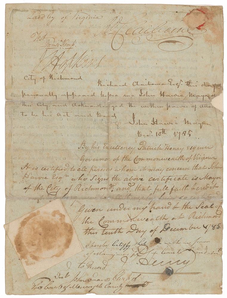 Partly-printed DS, signed “P. Henry,” one page both sides, 7.25 x 9.75, December 10, 1785. Document by which Richard Claiborne of Richmond, Virginia, appoints "Doctor Thomas Bond of the City of Philadelphia" as his power of attorney. Endorsed at the conclusion by John Harvie as mayor of Richmond, and certified below by Patrick Henry as governor of Virginia. The white seal affixed to the lower left remains intact. In very good condition, with scattered light toning, and some professional repairs to areas of paper loss and fold splitting.