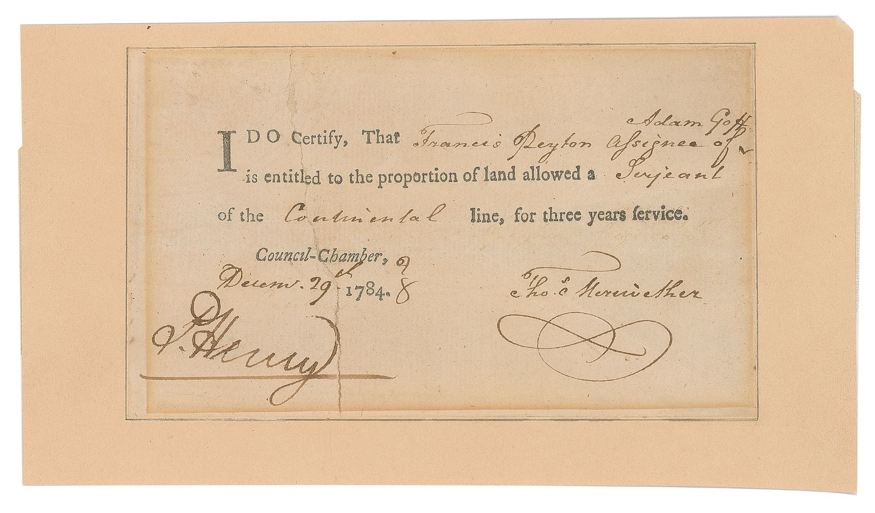 Partly-printed DS, signed “P. Henry,” one page, 6 x 3.5, December 29, 1784. Document certifying eligibility for a land bounty to a veteran of the Revolutionary War, in full: "I do certify, that Francis Peyton assignee of Adam Goff is entitled to the proportion of land allowed a Serjeant of the Continental line, for three years service." Signed at the conclusion by Patrick Henry and Thomas Meriwether. The document is professionally inlaid into a slightly larger sheet. In very good to fine condition, with a professionally repaired vertical tear, which just touches the end of Henry's signature.