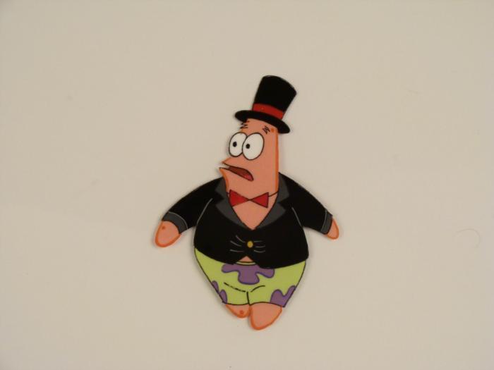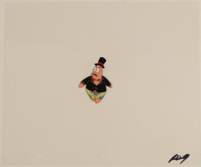 This original animation cel is from the Nickelodeon TV show SpongeBob Squarepants. The story takes place under the deep blue sea in Bikini Bottom, where SpongeBob resides. SpongeBob, who is a yellow, porous sponge, is your typical happy-go-lucky character, as he is always cheerful and enjoys making people laugh. Patrick Star, SpongeBob's neighbor who is a starfish, is your average children's show idiot, as he boasts knowing nothing and is often getting himself into ridiculous situations. Between the homes of these two lies the home of the miserable Squidward, a squid, who is known for being grouchy and playing tricks on SpongeBob and Patrick. Both SpongeBob and Squidward work at the Krusty Krab, a fast food business run by the greedy money-loving Mr. Krabs, a crab, the arch rival of the evil, possibly misunderstood, Plankton. Another neighbor, Sandy Cheeks, an athletic squirrel who normally wears an astronaut's space suit, was introduced in "Tea at the Treedome." She spends most of her time inventing and experimenting. Why is Patrick in a suit?Original Production Animated Cel Overall Size of Cel: 10 1/2" x 12 1/2" Very Good ConditionThis is an original hand-painted cel set-up used in the production of an episode of "SpongeBob SquarePants." Each one-of-a-kind set-up represents a slight change in position of the characters. When individually photographed and projected in rapid succession, the images appear to move.