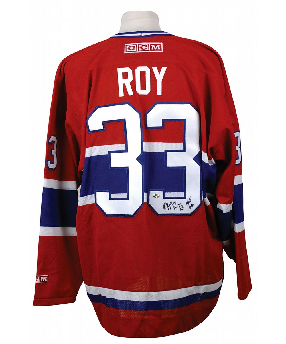 Official CCM replica Montreal Canadiens hockey jersey, with sewn on letters and numbers, signed in black felt tip on the number on the back, “Patrick Roy 33, HOF 06.” In very fine condition.