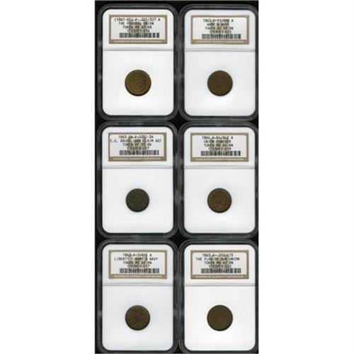<B>Patriotic Civil War Group.</B></I> Consists of: an <B>1863 Liberty/Army & Navy, Fuld 7/315A, R.2, MS62 Brown NGC; 1863 Liberty/Army & Navy, Fuld 11/298A, R.1, AU58 NGC; 1864 Union For Ever, Fuld 54/342A, R.1, MS64 Brown NGC; 1863 The Flag of Our Union, Fuld 212/415A, R.2, MS62 Brown NGC; (1861-65) The Federal Union/Army & Navy, MS63 Red and Brown NGC;</B></I> and a merchant token, an <B>1863 C.G. Bruce, War Claim Agent, Cleveland, OH, Fuld-OH-175C-3a, R.3, VF30 NGC.</B></I><BR><BR><b>Shipping:</b> Coin/Currency (<a target="_blank" href="http://www.heritageauctions.com/common/shipping.php">view shipping information</a>)