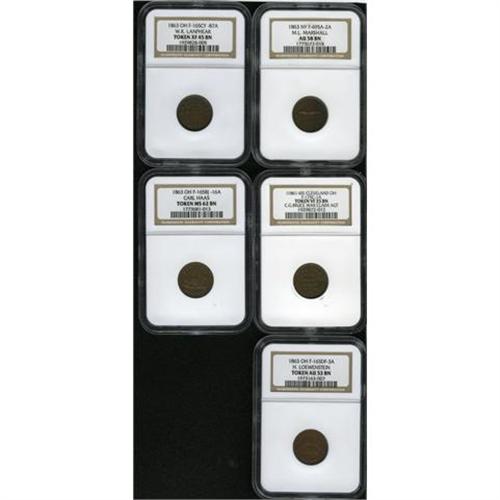 <B>Patriotic Civil War NGC-Certified Lot of Five Tokens.</B></I> Consists of: <B>1863 Fuld-NY-695A-2a, AU58 NGC; 1863 Fuld-OH-165BJ-16a, MS62 Brown NGC; 1863 Fuld-OH-165CY-87a, R.8, XF45 NGC; 1863 Fuld-OH-165DF-3a, R.7, AU53 NGC;</B></I> and an <B>(1861-65) Fuld-OH-175C-1a, VF35 NGC.</B></I> A personal inspection is suggested.<BR><I>From The Troy Wiseman Collection.</B></I>