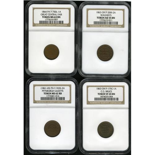 <B>Patriotic Civil War NGC-Certified Lot of Four Tokens.</B></I> Consists of: <B>1863 Fuld-OH-200I-2a, AU55 NGC; 1863 Fuld-OH-175C-1a, VF20 NGC; 1864 Fuld-PA-750L-1a, MS63 Brown NGC;</B></I> and an <B>(1861-65) Fuld-PA-765S-3a, MS62 Red and Brown NGC.</B></I> A personal inspection is suggested.<BR><I>From The Troy Wiseman Collection.</B></I>